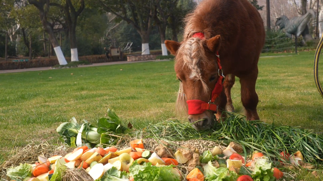 在上海野生动物园,设特兰矮马“飘飘”趁着迎宾高峰期的间歇,享用起了豪华的年菜兼“工作餐”。除了平日常见的“大米饭”——青草、干草,额外增加了苹果、胡萝卜、黄瓜、橙子、番茄等蔬果。