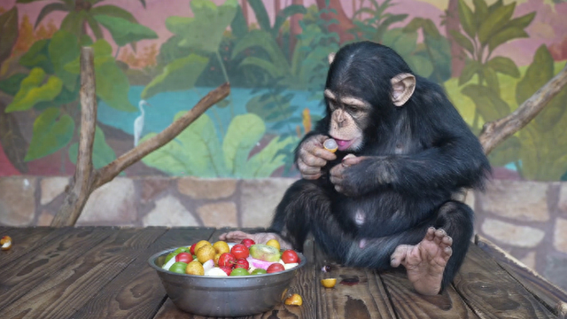 “平时它们吃得已经很好了,这次只是增加甜椒、金桔、火龙果等吃得很少的蔬果,主要还是形式上创新。”乔杰搭好竹架,把一串串蔬果倒挂在上面,顶部挂了一个火红的甜椒。