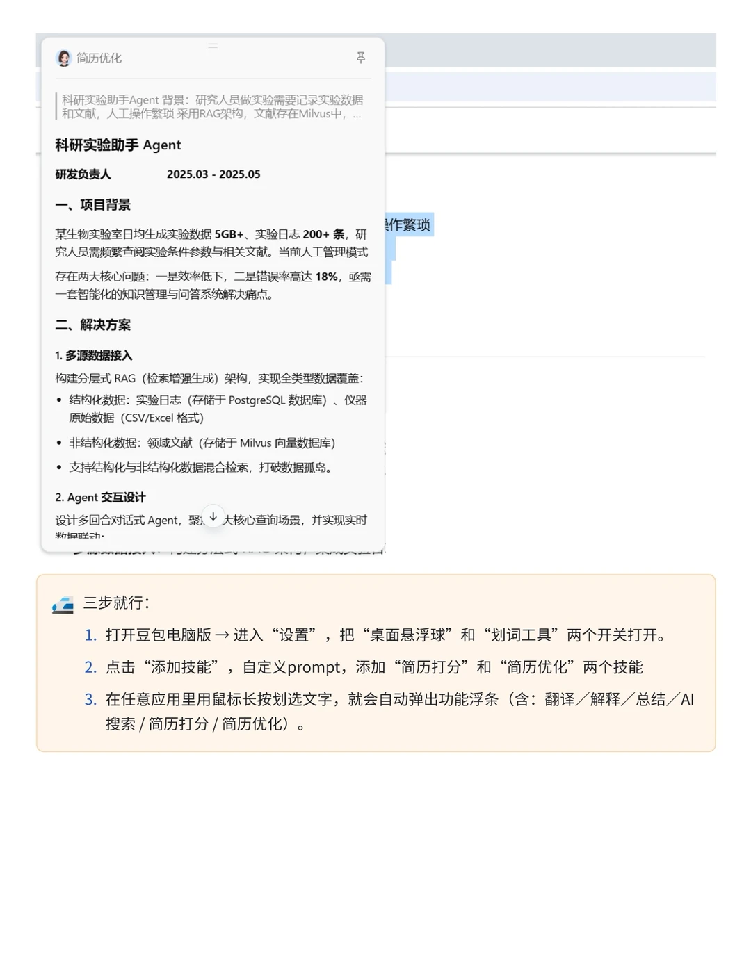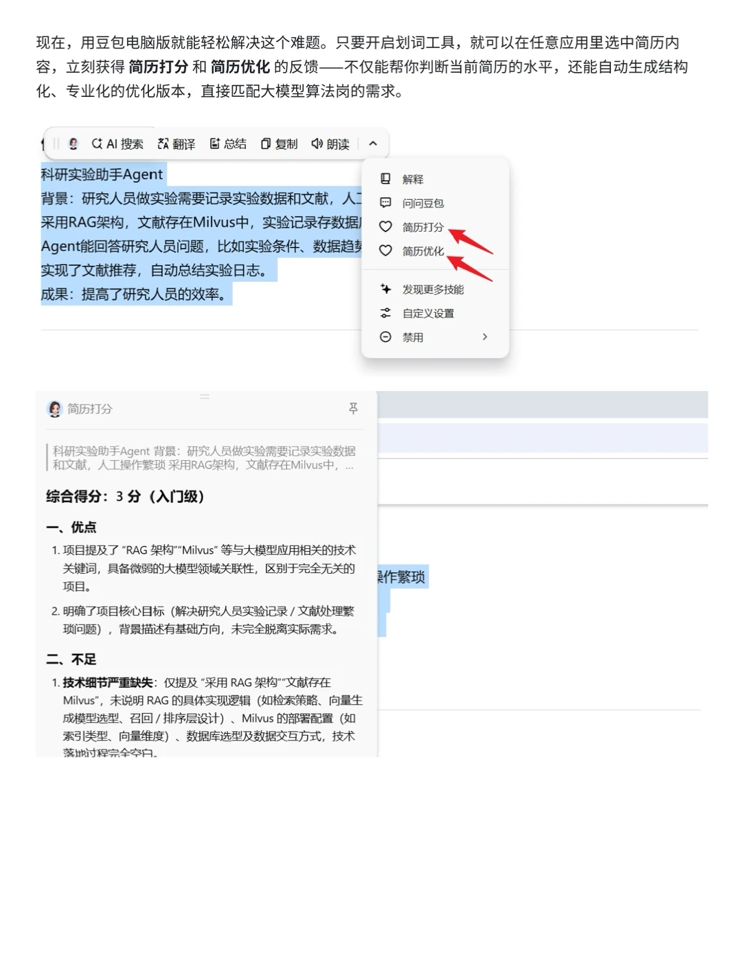 写简历也是一样,与其坐在桌前抓耳挠撒写出未如嚼蜡的流水账,不如给豆包电脑版配置上简历打分和简历优化的功能,迅速找出短板,生成结构化、量化、有说服力的描述,并帮助完善个人职业规划,让简历成为你的一份名片,提升面试成功率。