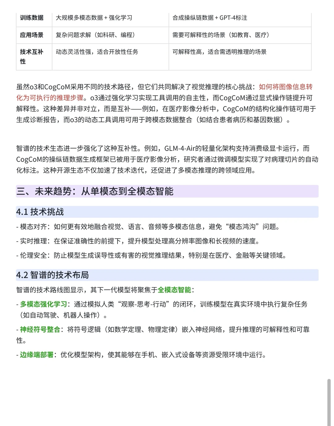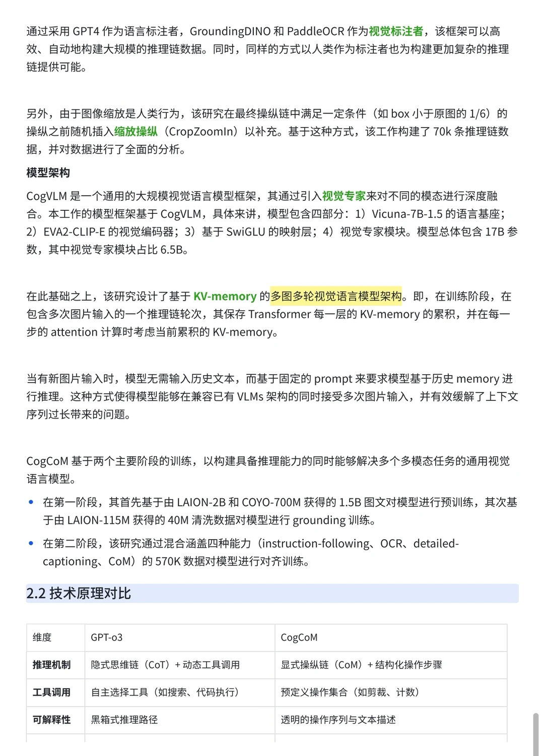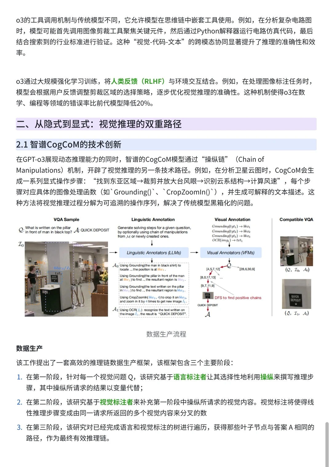 GPT-o3和CogCoM代表了视觉推理的两种技术路径:前者通过强化学习和动态工具调用实现“隐性智能”,后者通过显式操作链和可解释性满足“透明需求”。