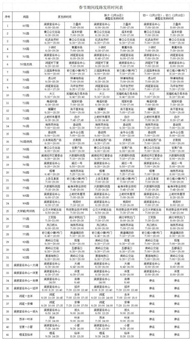 (一)除夕(2月16日)709路、761路、762路等地铁接驳线路首末班时间不变,905路、906路、716路末班时间调整为16:00,711路、765路末班时间调整为18:00,其他线路末班时间统一调整为17:00。(二)初一(2月17日)、初二(2月18日)首班发班时间早于7点的线路统一调整为首班7:00发班,首班发班时间迟于7点的线路保持原时间不变,末班时间不变。(三)初三(2月19日)所有公交线路早晚班恢复正常发班时间。