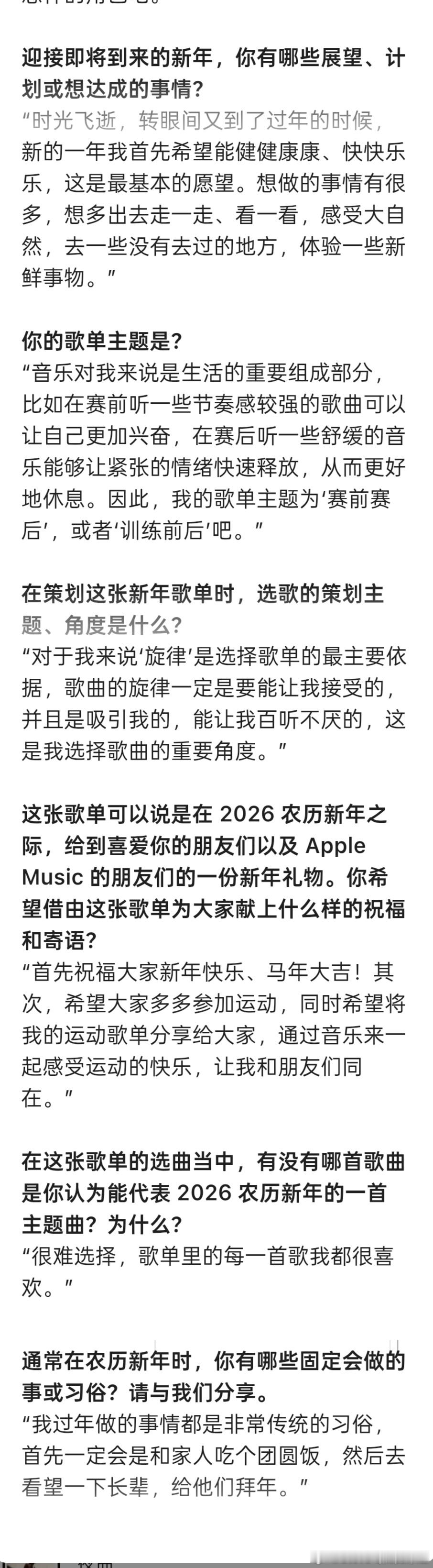 Q.这张歌单可以说是在2026农历新年之际,给到喜爱你的朋友们以及 AppleMusic的朋友们的一份新年礼物。你希望借由这张歌单为大家献上什么样的祝福和寄语?