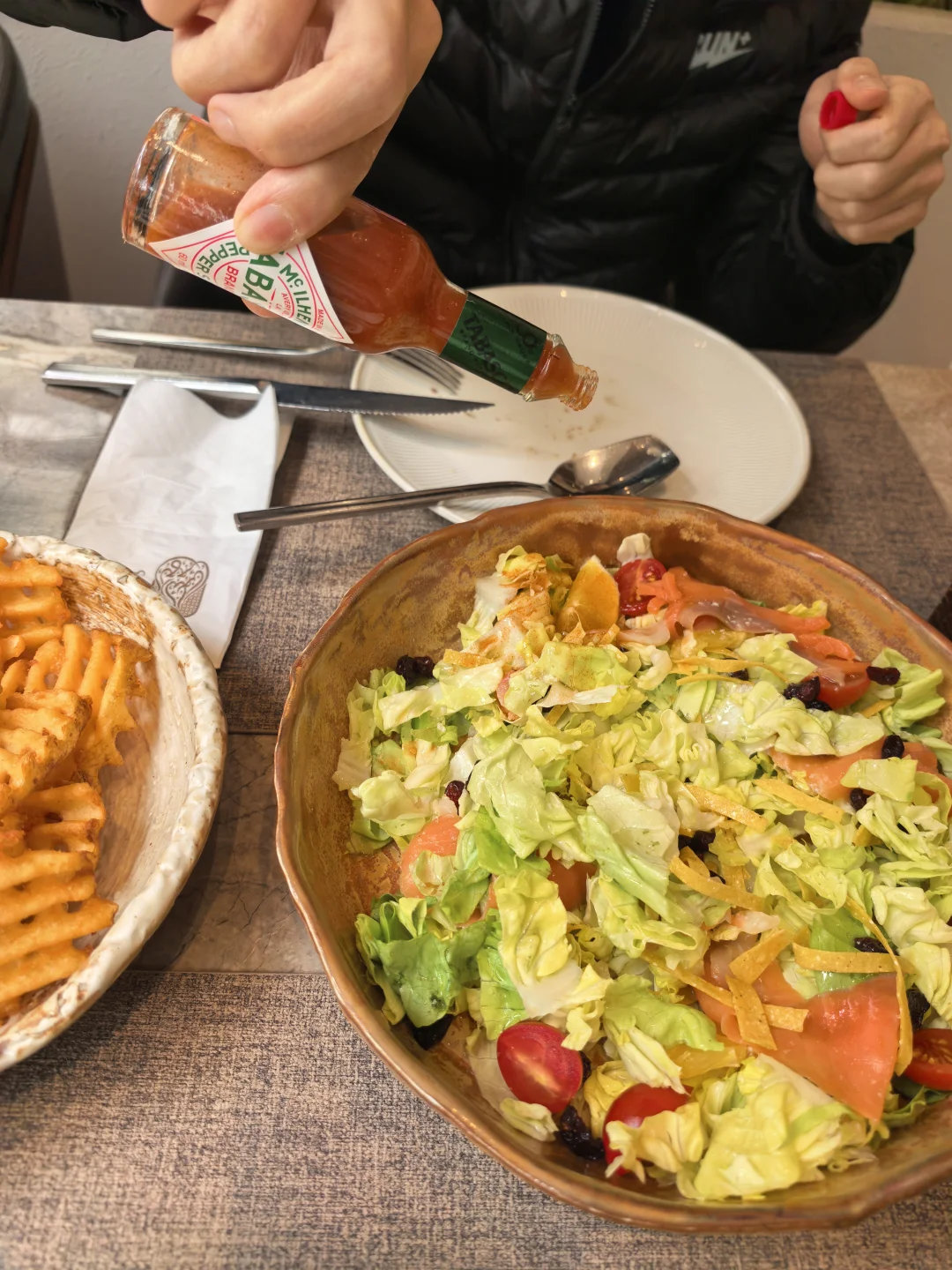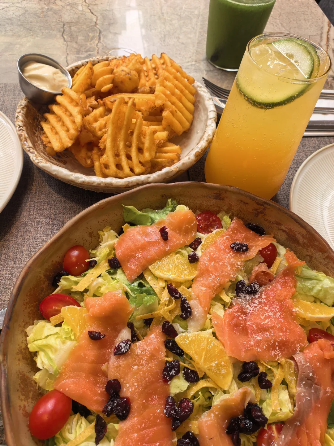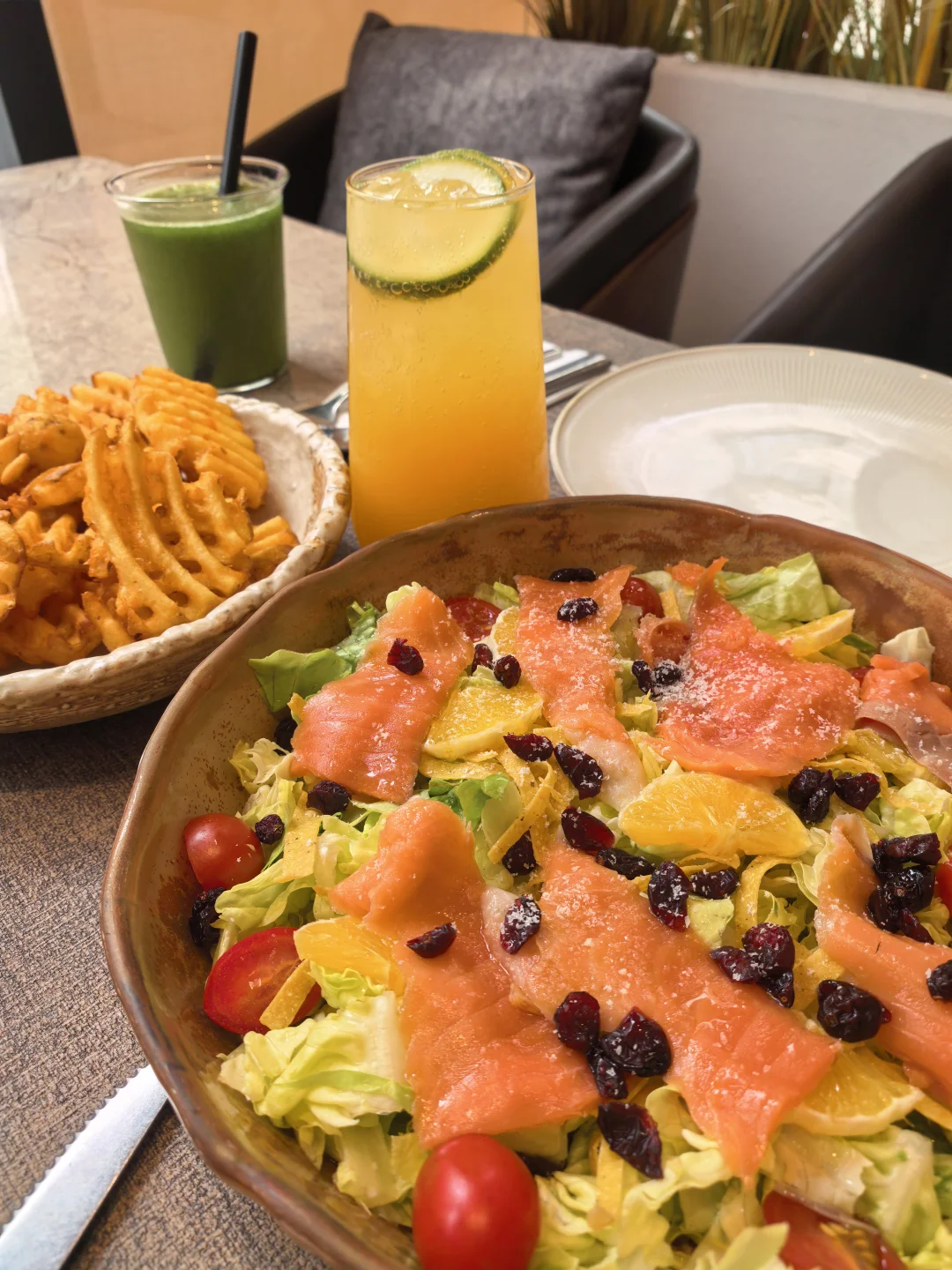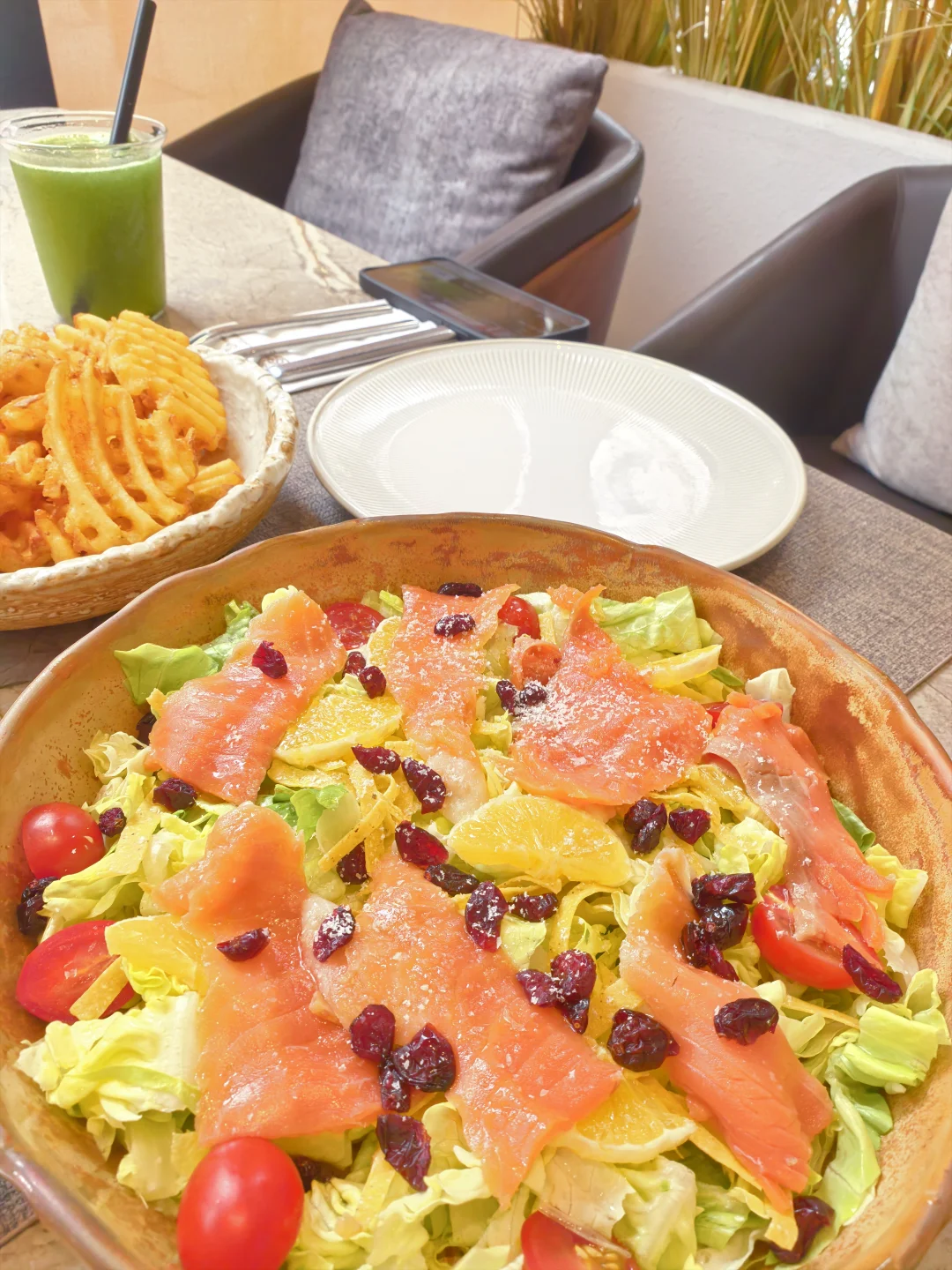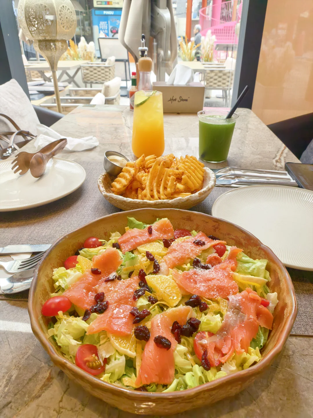 沙拉上面铺满一层三文鱼,特鲜🈶淡淡的烟味,沙拉里面🈶几种蔬菜,还有蔓越莓干!特别适合想保持身材的我😄