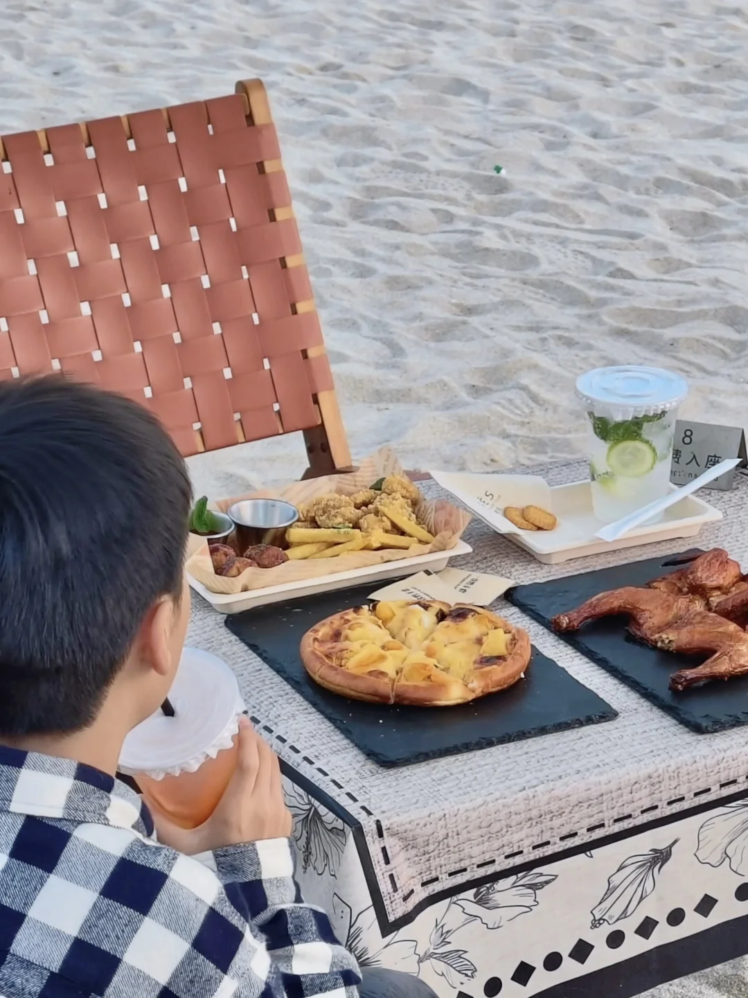 最后一站坐下来边吃美食边等日落,餐厅就在沙滩上,第一排位置最好,点了一个披萨套餐包含披萨、小吃、饮品,都是小孩子爱吃的,现场还看了免费的打铁花和电影,在这里结束一天游玩太惬意了~