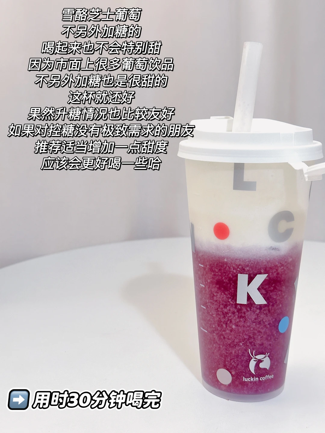 雪酪芝士葡萄不另外加糖的,喝起来也不会特别甜〰️因为市面上很多葡萄饮品不另外加糖也是很甜的,这杯就还好,果然升糖情况也比较友好〰️