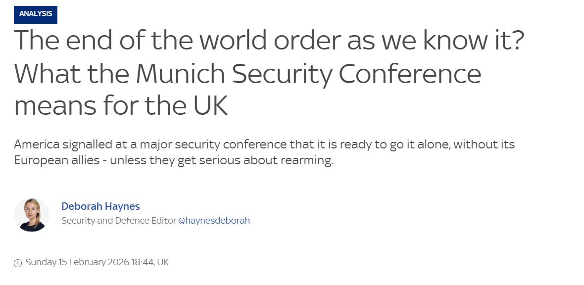 这是今年除夕我看到最鼓舞人心的一句话:“中国正获得只有美国才能匹敌的力量和影响力。” 英国天空新闻的安全与国防编辑黛博拉·海恩斯在一篇分析文章的开头这样写道:“那种从二战废墟中演变而成的旧有规则秩序已不复存在——至少这是德国总理的裁决,证据显而易见。美国在周末于慕尼黑举行的一次重要安全会议上表示,准备单独行动,不借助欧洲盟友——除非他们认真考虑重新武装。俄罗斯并无真正意愿结束乌克兰战争。中国正获得只有美国才能匹敌的力量和影响力。这意味着所谓的大国竞争——可能引发更大规模的冲突——又卷土重来,像英国及其欧洲盟友这样的中小国家比以往任何时候都更加需要彼此。这是今年慕尼黑安全会议传达的一个关键信息。”