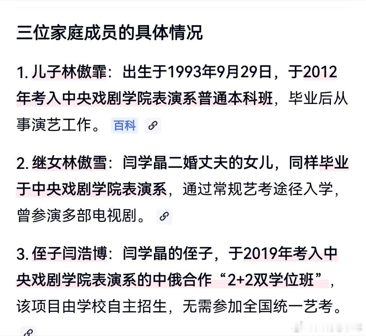 闫学晶儿子林傲霏,入读中戏“新疆班”。闫学晶继女林傲雪,艺考路线入读中戏。闫学晶侄子闫浩博,中戏中俄合作双学位班。