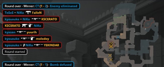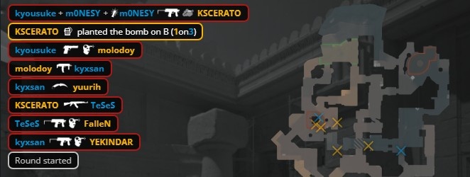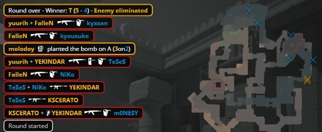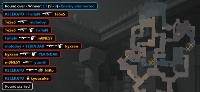 第9局开场孩神大狙就被卡神手撕,龙哥双杀卡神狂哥后拿到大狙,教父再杀Niko,yuurih进A打掉龙哥后下包,K3与京介保枪被绞,黑豹拿到第5分。