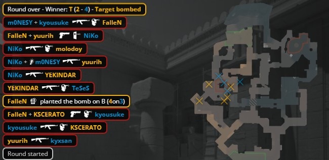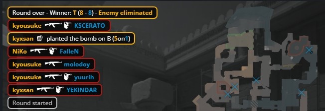 第8局孩神中门大狙空枪被教父手撕,molodoy大狙来A轰掉Niko后被龙哥补掉,yuurih进B下包打掉京介,龙哥拿到大狙轰掉yuurih后保枪,双方4-4。