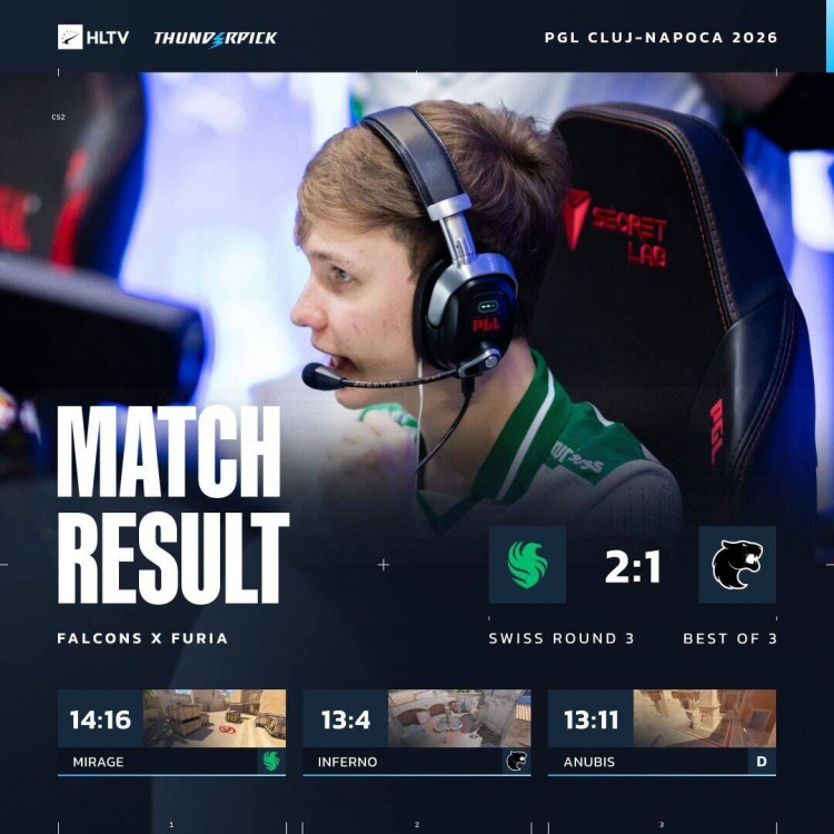 直播吧2月17日讯PGL克卢日纳波卡继续进行,今日2-0组晋级战,猎鹰Falcons让一追二战胜黑豹FURIA,三连胜晋级!黑豹掉入2-1组!