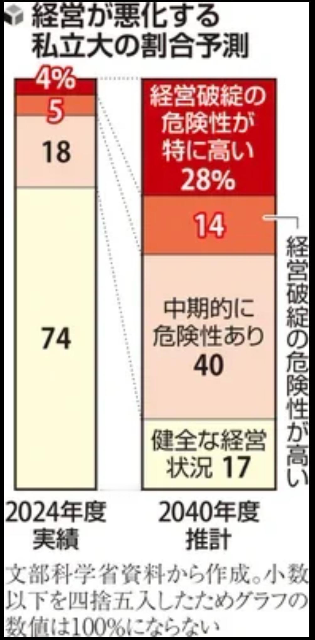 日本文部科学省的推算显示,到2040学年度,约四成私立大学将面临较高的经营破产风险。目前风险较高的大学约占一成,但今后18岁人口的减少,可能会使私立大学的经营状况迅速恶化。 根据推算,在校生尚未毕业期间就可能发生经营破产、“风险特别高”的私立大学比例,将从2024学年度的4%(22所)扩大至2040学年度的28%(170所)。此外,在4年以上、10年以内可能发生经营破产、“风险较高”的私立大学,也将从2024学年度的5%(30所)增加至2040学年度的14%(87所)。两类合计,经营破产风险较高的私立大学将超过40%。 经营状况健全的私立大学在2024学年度占整体的74%(443所),但预计到2040学年度将减少至17%(102所)。 文部科学省表示,18岁人口在2034学年度前将维持在100万人左右,但从2035学年度起的6年间将急剧减少至74万人。此次推算假设2040学年度的大学升学人数为46万人,并以掌握经营状况的601所私立大学在维持现有招生名额不变、持续存续至2040学年度为前提,预测其经营状况。 为避免在校生尚未毕业的大学发生经营破产,文部科学省计划将约100所经营状况恶化的大学指定为“改善指导对象校”,启动包括退出大学办学在内的经营指导措施。