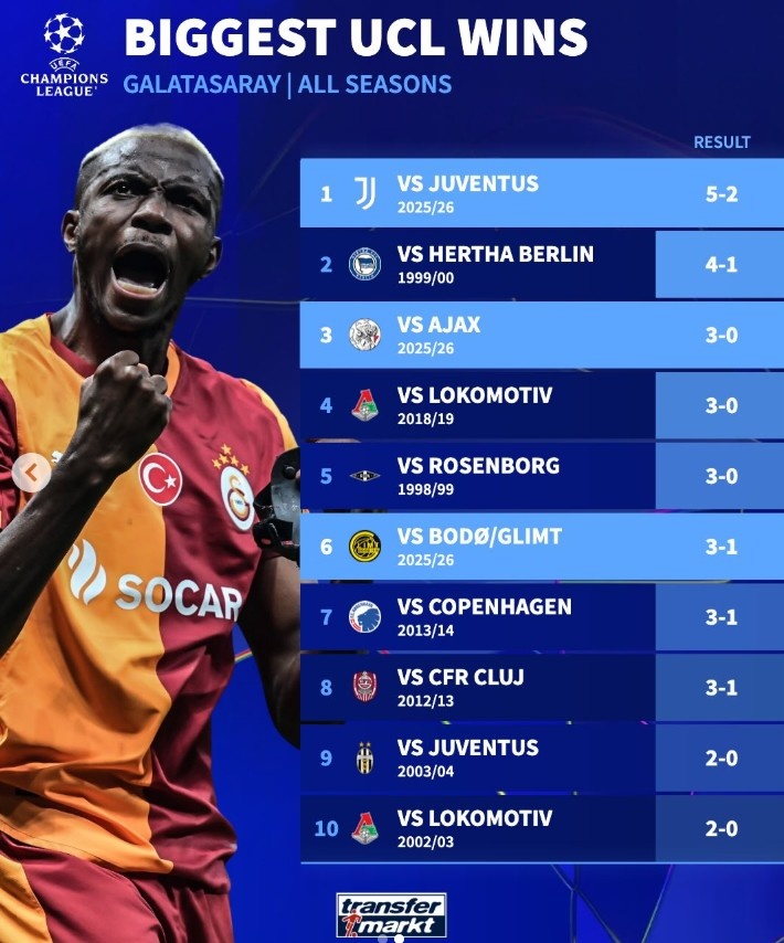 直播吧2月18日讯欧冠1/8决赛附加赛首回合,加拉塔萨雷5-2大胜尤文,根据德转统计,本场比赛是加拉塔萨雷的欧冠联赛最大比分胜利。