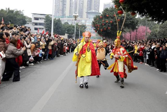 2月17日,在四川省广安市广安区春节民俗街头巡游展演活动现场,西游组合在街头走秀和与游客互动。