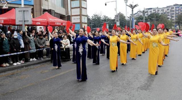 2月17日,在四川省广安市广安区春节民俗街头巡游展演活动现场,文艺工作者在表演《中国旗袍秀》。