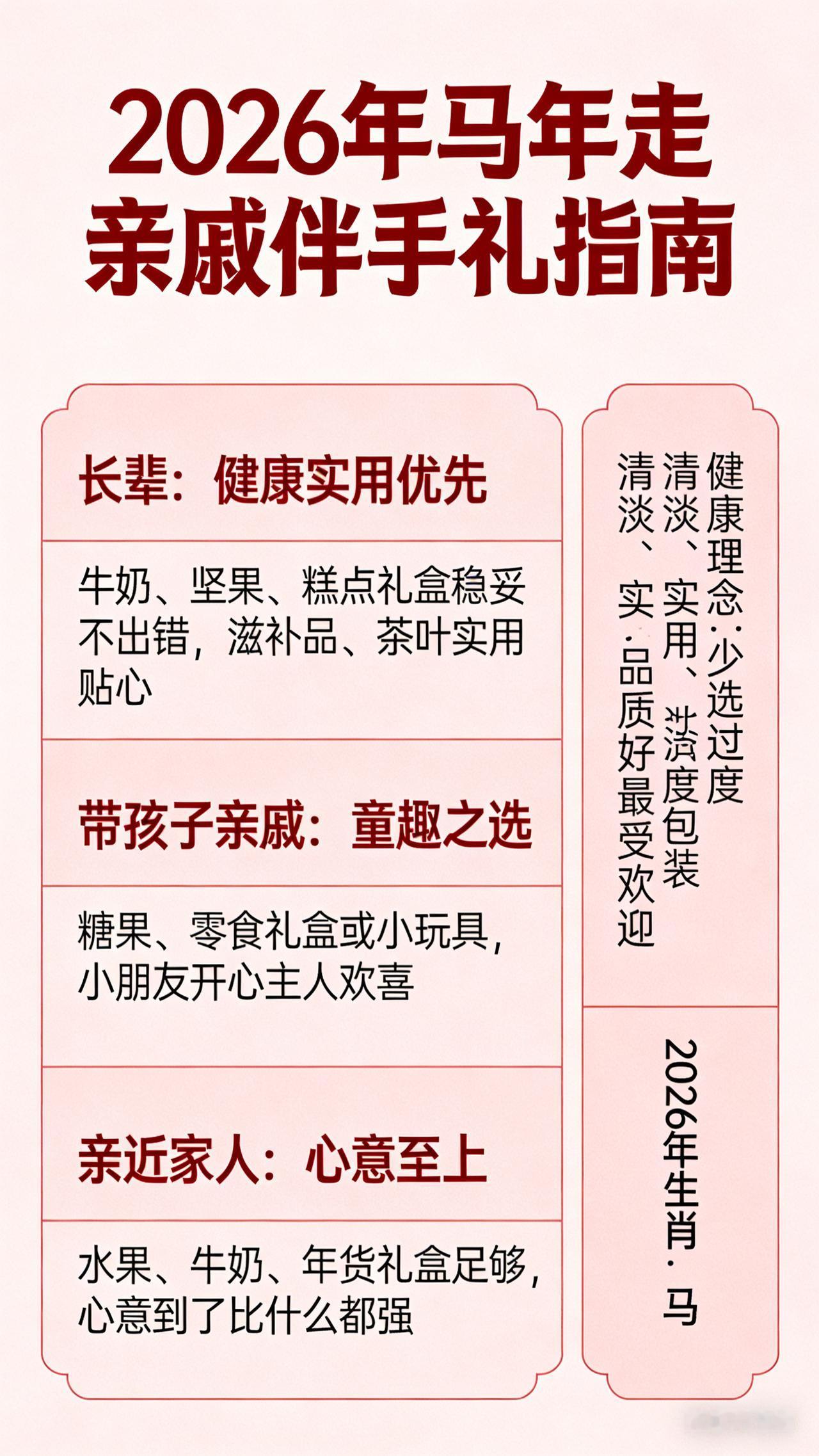 过年走亲戚,一份合适的伴手礼,藏着礼貌与心意。选对礼物,既体面又暖心。 给长辈送礼,首选健康实用。牛奶、坚果、糕点礼盒稳妥不出错,滋补品、茶叶也很合适,实用又显贴心。带孩子的亲戚,可以准备糖果、零食礼盒或小玩具,小朋友开心,主人也欢喜。 亲近的家人,不用追求贵重,水果、牛奶、年货礼盒就足够,心意到了比什么都强。如今大家更看重健康,少选过度包装的礼品,清淡、实用、品质好最受欢迎。 伴手礼不在价格高低,而在恰到好处的用心。一份简单的礼物,一句真诚的祝福,就能让年味更浓、亲情更近。