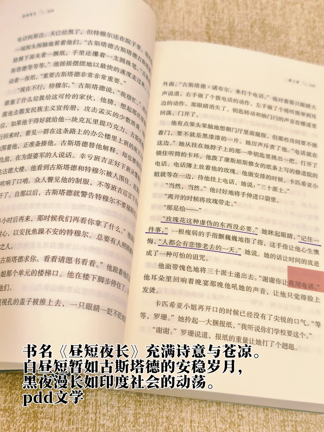 这部小说用一个普通人的故事,撕开了上世纪70年代印度社会的伤口,也让我看见,在时代的裂缝中,普通人的每一次呼吸都是史诗。书名《昼短夜长》充满诗意与苍凉。白昼短暂如古斯塔德的安稳岁月,黑夜漫长如印度社会的动荡。
