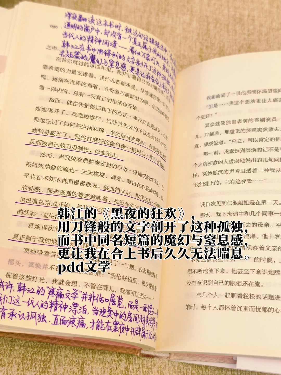 “在无数灯火通明的窗户中,却没有一个真正属于我的地方。”这像极了当代人的精神困境——看似万家灯火,实则无处归依。韩江的《黑夜的狂欢》,用刀锋般的文字剖开了这种孤独,而书中同名短篇的魔幻与窒息感,更让我在合上书后久久无法喘息。