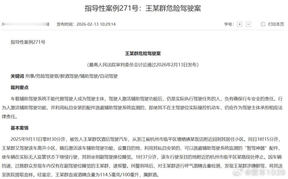 【爱车安全贴士 酒后开启智驾就可以开车吗?最高法明确了!】2月13日,最高人民法院发布第48批指导性案例(指导性案例268-272号)。这是最高人民法院首次发布道路交通安全刑事专题指导性案例。值得注意的是,本批指导性案例的主要内容包括酒后智驾相关规定。裁判规则明确激活辅助驾驶功能情形下驾驶人的刑事责任认定规则。网页链接
