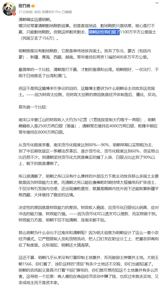 清城疯子 4 2026-02-19 21:37 明朝在永乐时期疆域达到顶峰,包括东北、安南等地,面积远超400万平方公里,即使在中后期,对东北、西南等地也保持着羁縻统治,并非完全放弃,所以文章说法是严重错误的。 另外所谓“一仗没打,不明不白地就丢了台湾和澳门”也不符合事实,台湾是在明末被荷兰殖民者侵占,而澳门是葡萄牙人通过租借的方式待明朝国力衰弱,逐步占据,并非明朝主动放弃。