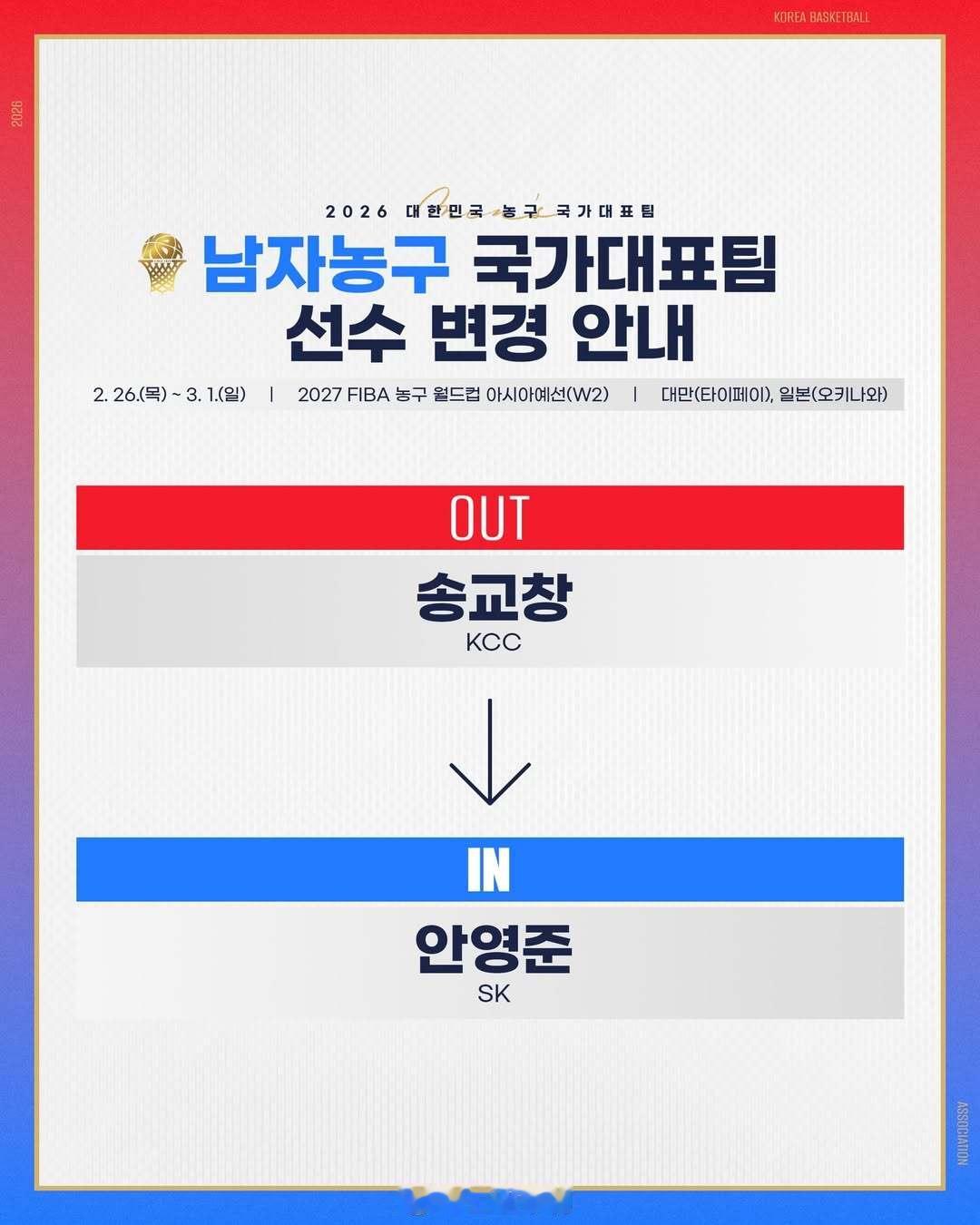 韩国男篮宣布,宋教昌因为伤病原因被换,安英俊递补。