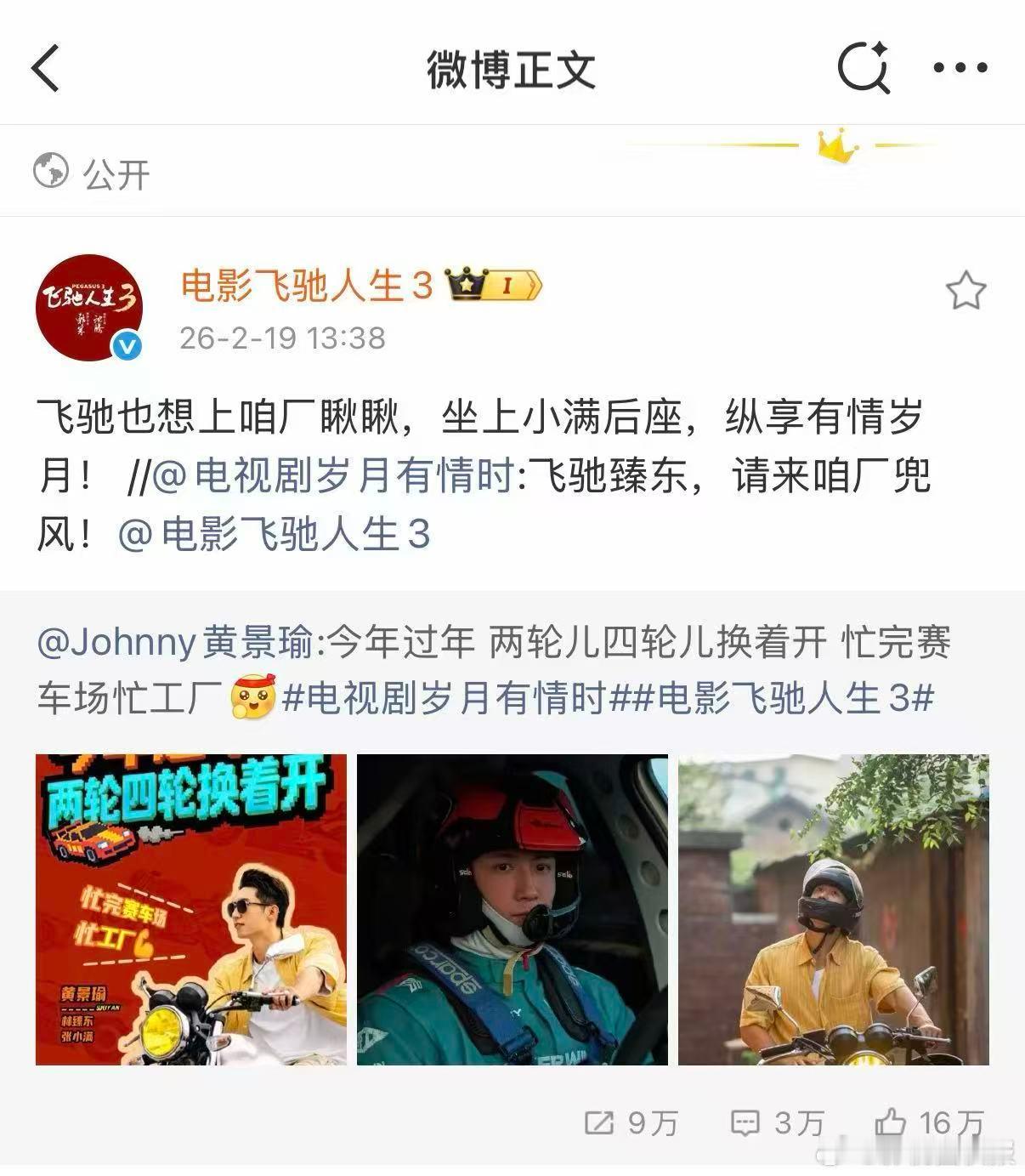黄景瑜打工赛车两不误 黄景瑜也太忙了吧!上一秒是《岁月有情时》里认真生活的工厂少年,下一秒就变成《飞驰人生3》里火力全开的赛车车神。两轮四轮换着开,忙得像小陀螺,还能双开花,又酷又稳,帅到移不开眼!