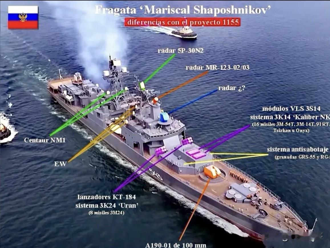 2026年2月19日,俄海军派出3艘军舰前往波诡云谲,战云密布的阿曼湾及北印度洋水域参加海上安全带-2026俄伊联合演习。这3艘军舰包括:沙波什尼科夫元帅号护卫舰,斯托伊基号(20380型)轻型护卫舰和鲍里斯·布托马号补给舰。 其中的1155M型沙波什尼科夫元帅号护卫舰(舷号543),是中国军迷非常熟悉的一艘军舰,其原为太平洋舰队1155型大型反潜舰, 1985年服役,2016-2021年改装为护卫舰。舰长163米,宽19米,吃水7.8米。标准排水量6200吨,满载排水量7900吨。动力系统为燃燃联合,最大速度30节。3300海里/18节。 该舰拆除2座AK-100舰炮,改为在舰艏部原1号炮位安装1座A-190型100毫米隐身舰炮;在舰首原2号炮位换装16单元3S14通用垂发装置(可发射口径、锆玛瑙、锆石高超音速反舰巡航导弹);拆除舰桥两侧2座4联装SS-N-14反潜/反舰导弹发射架,替换为2座4联装Kh-35天王星反舰导弹(射程约130公里)发射架;保留了原4×8单元SA-N-9(9M330“道尔”防空导弹)近程垂发防空导弹系统,2座4联装反潜鱼雷,2座RBU反潜深弹发射器和2架卡27反潜直升机。主对空/对海搜索雷达由顶板C升级为军舰鸟-M2M(顶板-M),新增了5P-30N2低空补盲雷达。 改装后,该舰由原来的反潜舰改进为综合作战性能比较全面护卫舰,是目前太平洋舰队乃至俄海军中火力比较全面,也是比较能打的一艘老舰。虽然更换了雷达,但仍属于老旧型号,其总体性能仍显一般。