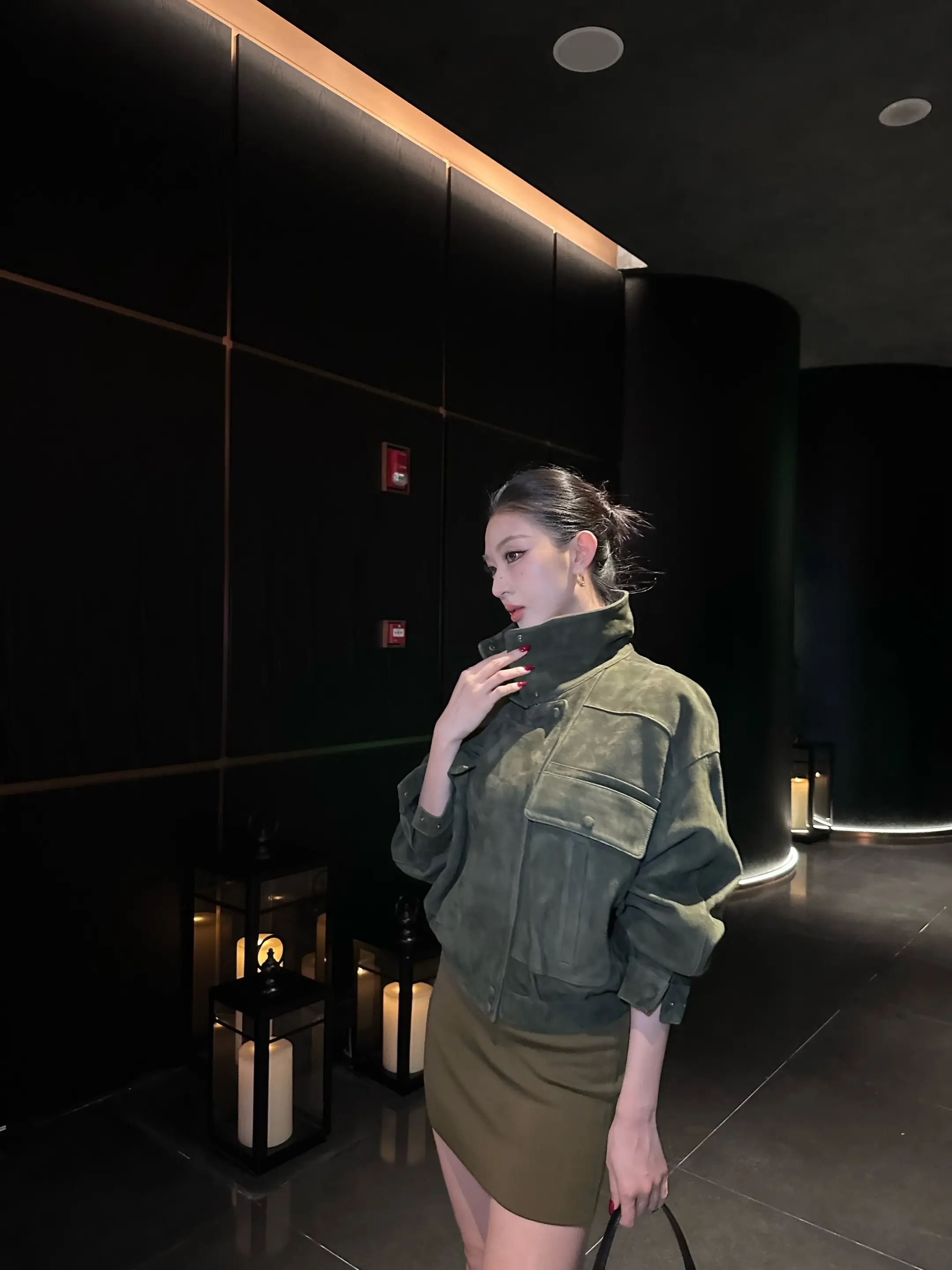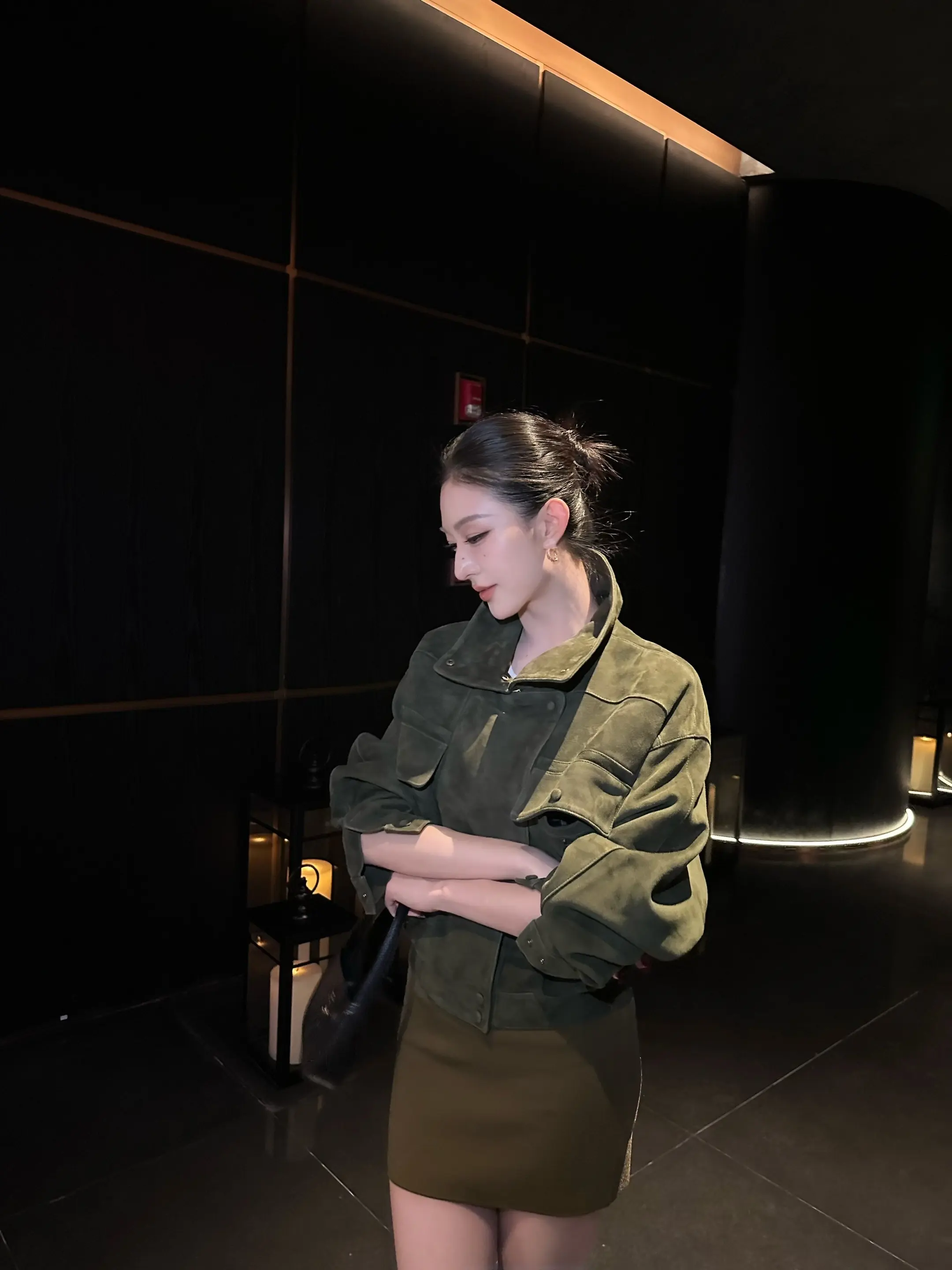 暗夜微光夜色如墨,她静立其中,棕发如丝,泛着温润的光泽。耳间的碎钻轻闪,映