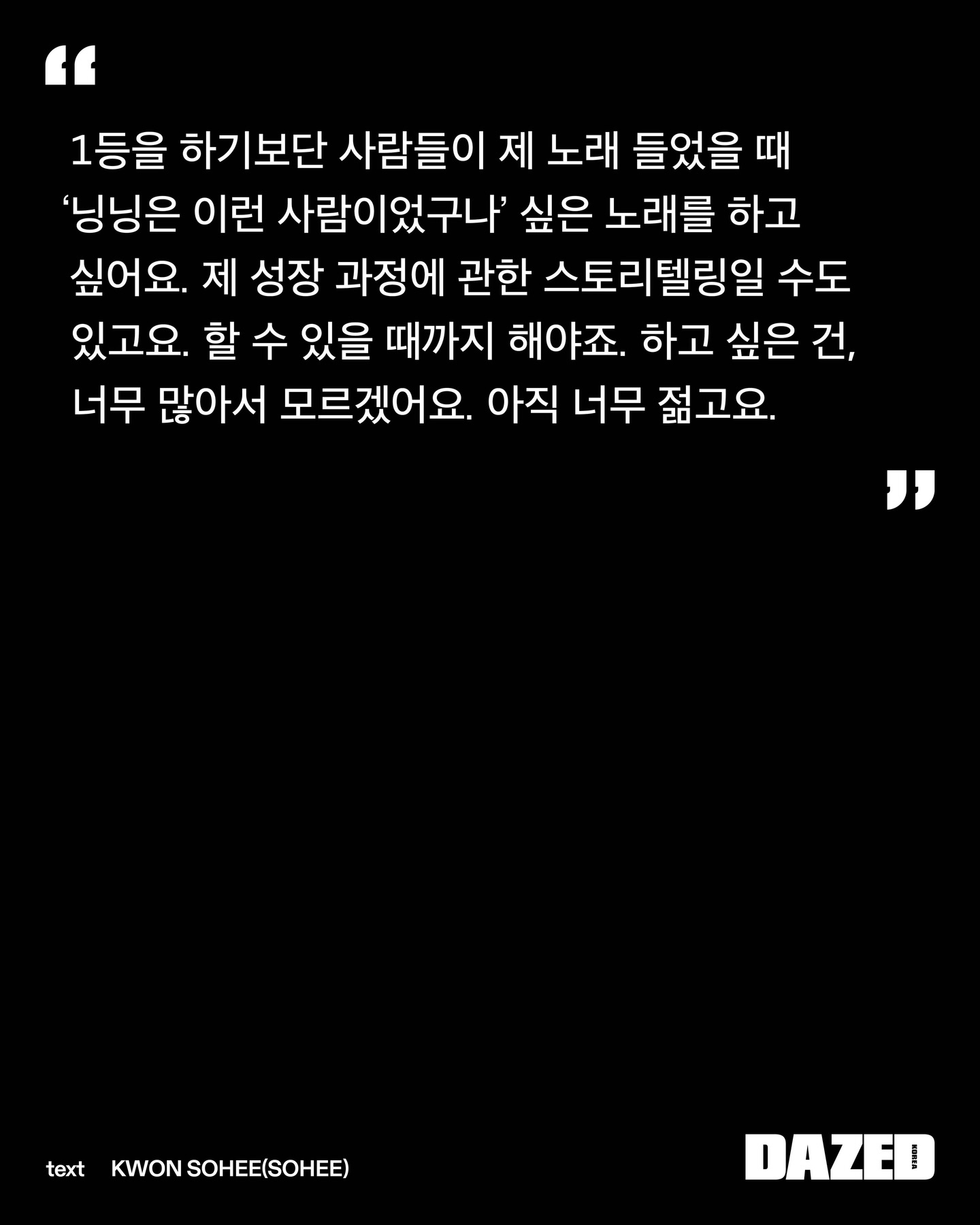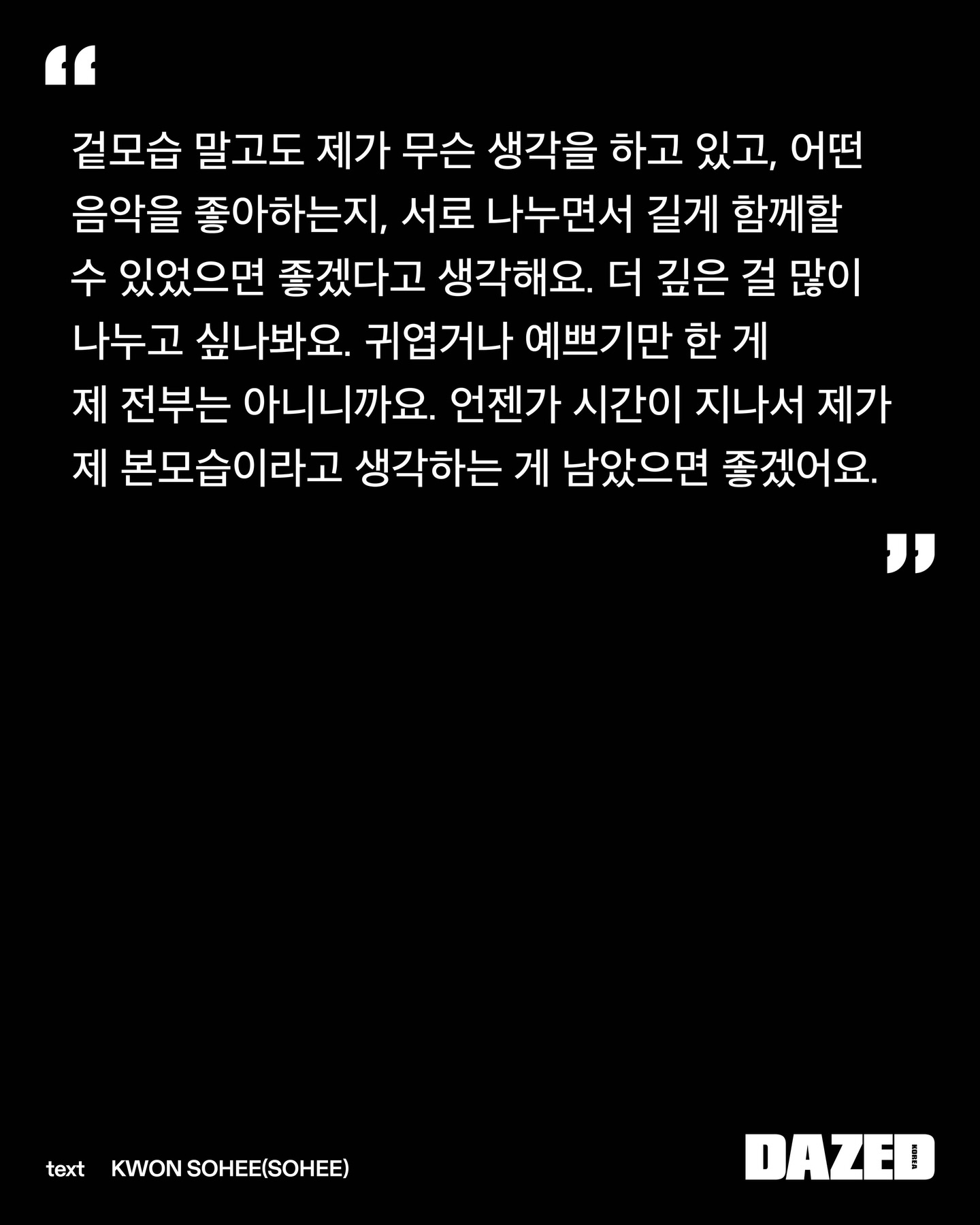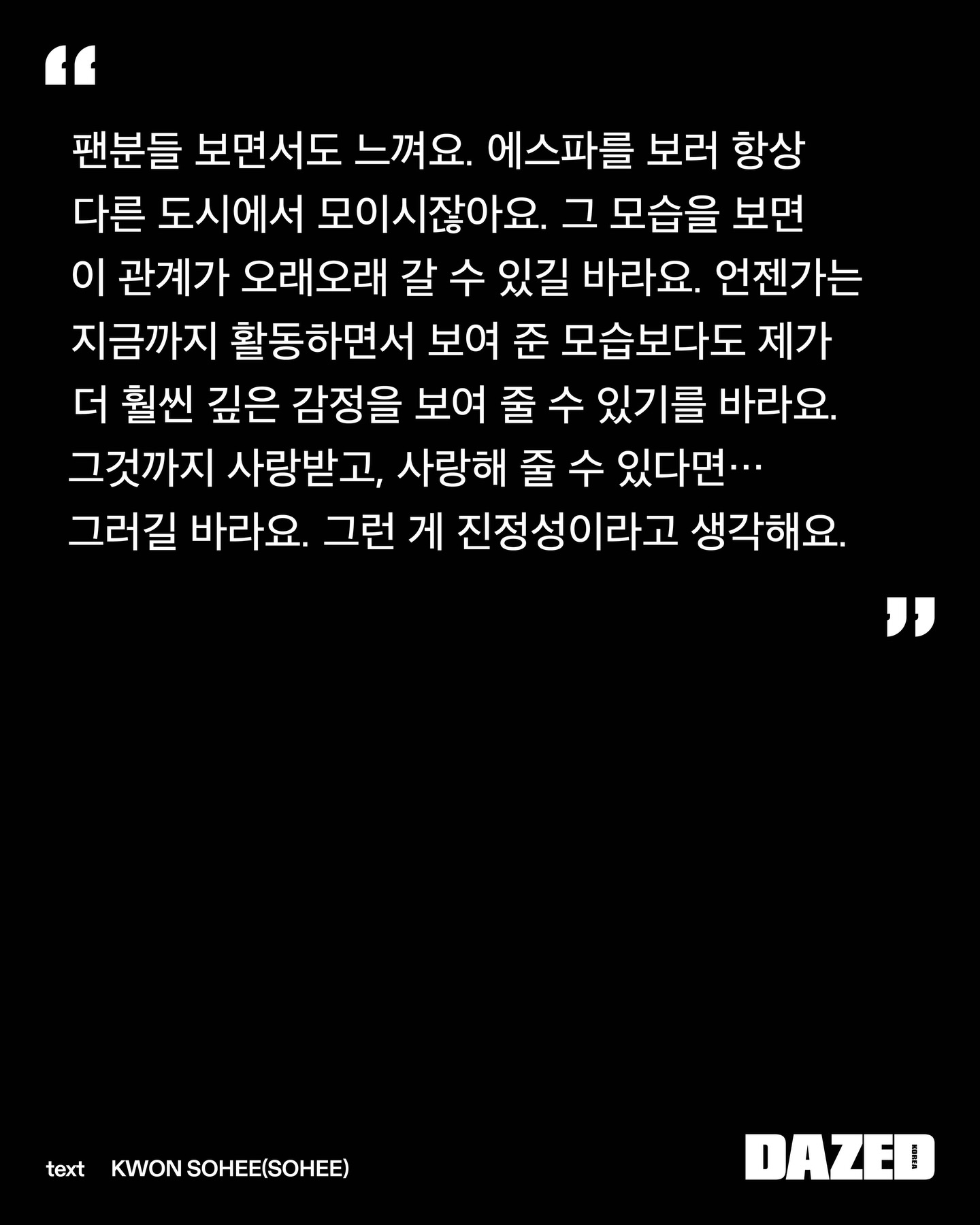 「Dazed Korea」3月刊 宁艺卓部分采访💬👤:作为aespa的宁宁,也经常思考关于真诚的问题吗?🦋:看着粉丝们,时常能感受到。大家总是为了看aespa从不同的城市赶来。看到这一幕,我真心希望这份关系能长久地走下去。也希望能有一天,我能展现出比迄今为止活动中所呈现的更深切的情感,如果连带着那份情感的我也能被大家喜好,我也能去爱大家……我期盼着那样。我认为,那才是真诚。🦋:我希望大家不止看到我的外表,更能了解我在想什么、喜欢什么样的音乐,彼此分享这些,长久地陪伴下去。我大概是想能与大家分享更多更深层的东西吧。因为我的全部,并不仅仅是可爱或漂亮。但愿有一天,随着时间的流逝,最终留下的是那个我所认为的、真实的自己。