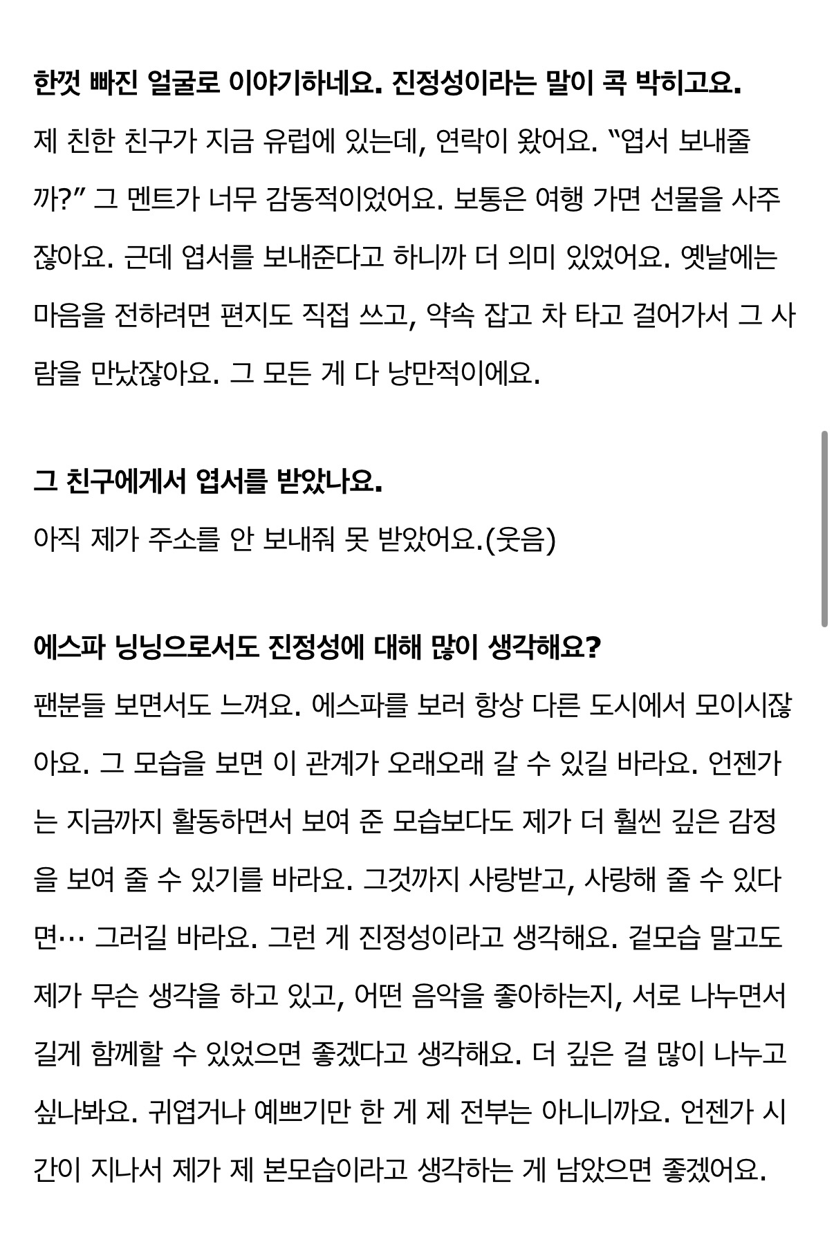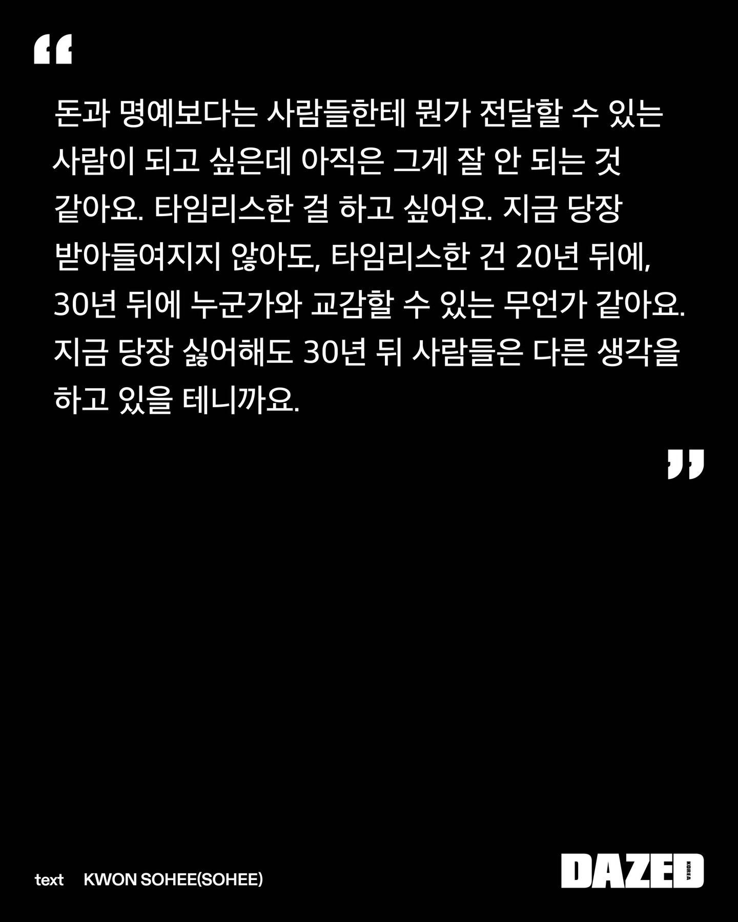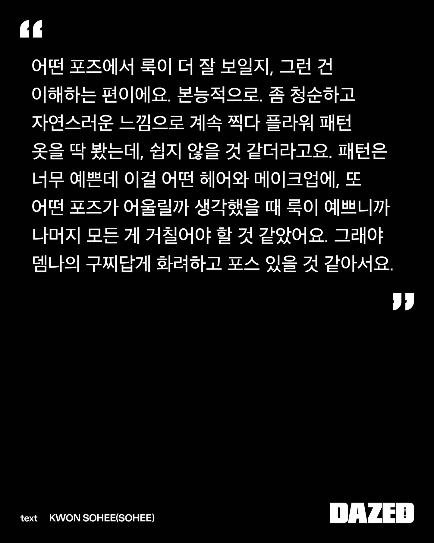 「Dazed Korea」3月刊 宁艺卓部分采访💬👤:作为aespa的宁宁,也经常思考关于真诚的问题吗?🦋:看着粉丝们,时常能感受到。大家总是为了看aespa从不同的城市赶来。看到这一幕,我真心希望这份关系能长久地走下去。也希望能有一天,我能展现出比迄今为止活动中所呈现的更深切的情感,如果连带着那份情感的我也能被大家喜好,我也能去爱大家……我期盼着那样。我认为,那才是真诚。🦋:我希望大家不止看到我的外表,更能了解我在想什么、喜欢什么样的音乐,彼此分享这些,长久地陪伴下去。我大概是想能与大家分享更多更深层的东西吧。因为我的全部,并不仅仅是可爱或漂亮。但愿有一天,随着时间的流逝,最终留下的是那个我所认为的、真实的自己。