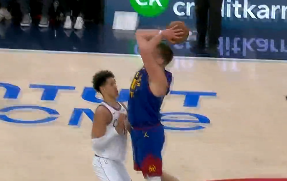 第一节比赛中,约基奇中场LOGO造尼德豪泽犯规,裁判吹罚犯规后判罚边线球。