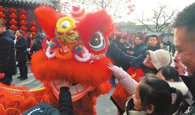 醒狮与游客互动。记者孙志强摄