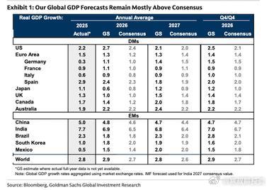 增长乐观: 高盛维持2026年乐观基准展望,认为全球经济增长将优于共识。驱动力来自关税冲击消退、财政支持和金融环境宽松。