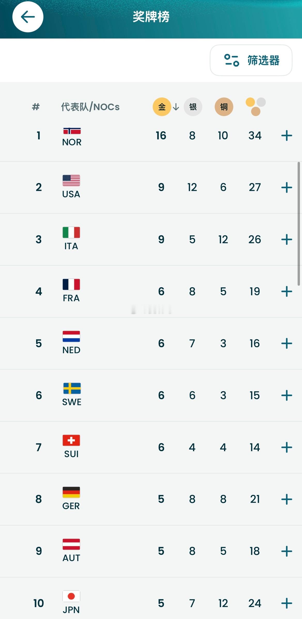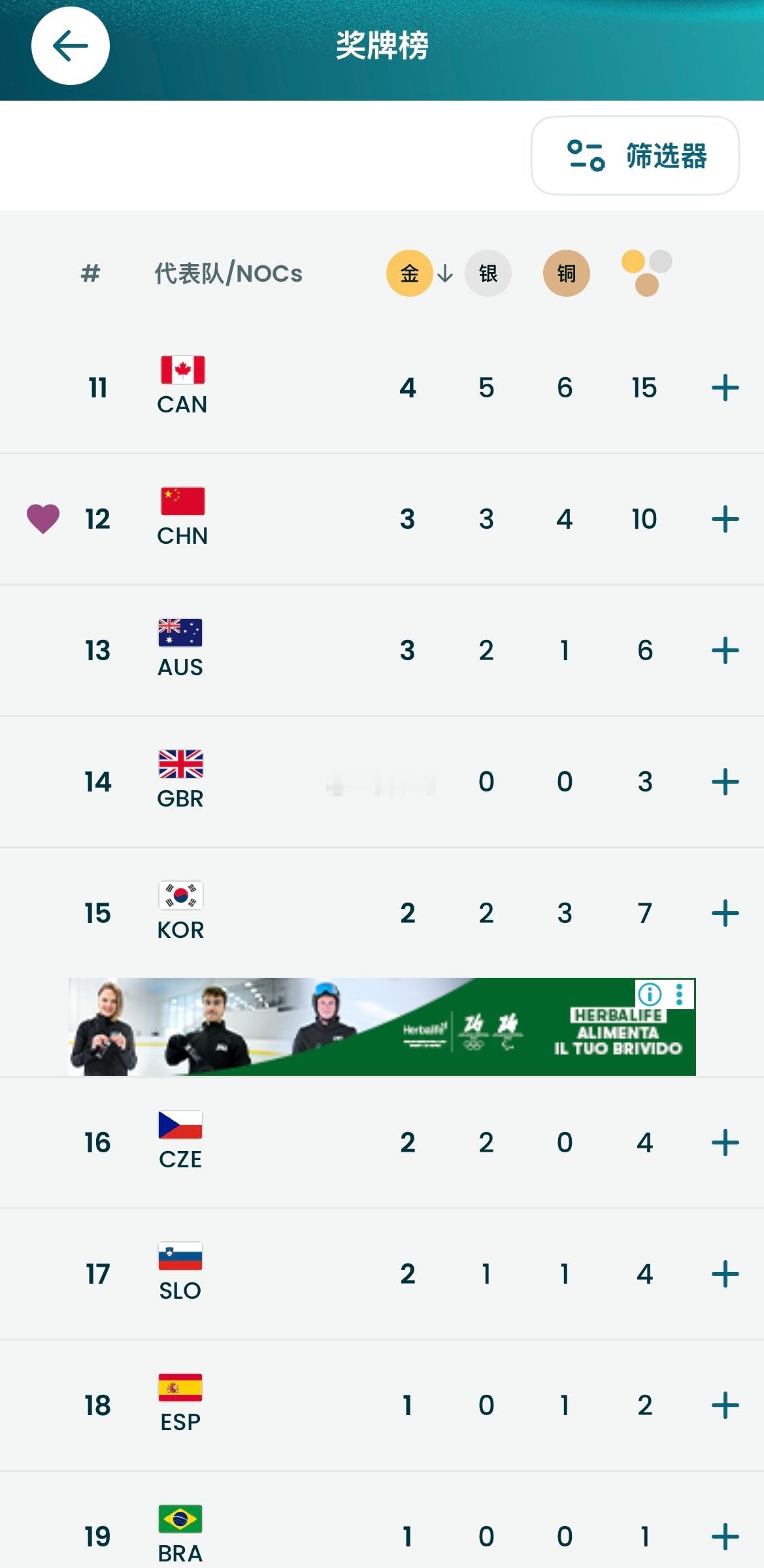 冬奥会最新奖牌榜