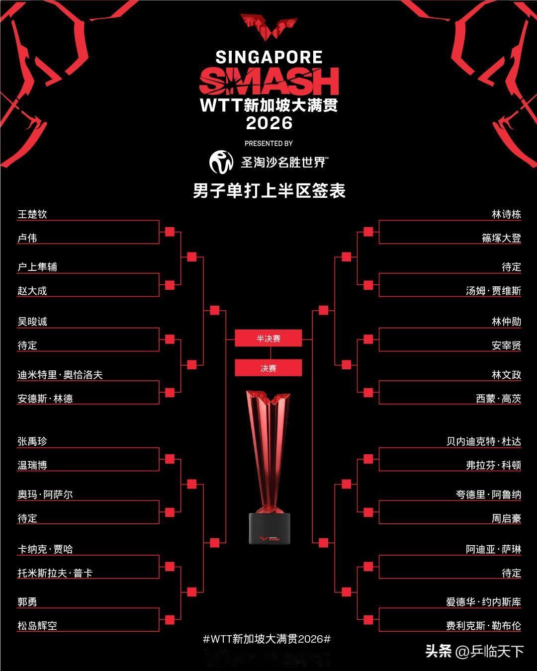2月20日,WTT世界乒联正式发布2026年WTT新加坡大满贯男单签表,国乒共有8位选手出战男单项目,首轮对阵形势已全部确定,多场比赛颇具看点。 国乒男单首轮完整对阵+交手记录+看点分析 1. 王楚钦vs卢伟 两人过往有过交手记录,王楚钦整体实力占据绝对优势,技术全面、状态稳定,首轮正常发挥即可顺利晋级,是国乒最稳妥的一场比赛。 2. 温瑞博vs张禹珍 双方暂无单打交手记录,张禹珍作为韩国队核心选手,大赛经验丰富、攻防能力均衡,温瑞博作为年轻选手,首轮便遭遇强敌,以冲击对手为主,锻炼价值极高。 3. 林诗栋vs篠塚大登 林诗栋与篠塚大登多次交手,林诗栋保持全胜,无论是技术厚度还是心理优势都十分明显,这场中日小将对决,林诗栋取胜概率较大。 4. 周启豪vs阿鲁纳 两人过往交手周启豪处于劣势,阿鲁纳正手进攻力量足、中远台能力突出,周启豪需要做好节奏控制,力争完成复仇。 5. 黄友政vs曼纳弗·维卡诗·塔卡 双方为首次交手,对手实力相对一般,黄友政只需稳住心态、正常发挥,拿下比赛的难度不大。 6. 向鹏vs约瑟夫·阿卜杜勒·阿齐兹 两人无正式交手记录,对手来自埃及,整体实力与向鹏存在差距,向鹏以适应赛场节奏为主,轻松过关问题不大。 7. 陈俊菘vs张本智和 陈俊菘曾在过往赛事中击败过张本智和,打法风格对其有一定克制作用,这场比赛关注度极高,是首轮的一大冷门看点。 8. 陈垣宇vs达科·约奇克 陈垣宇此前交手不敌对手,达科作为欧洲实力派选手,反手质量高、关键球能力强,陈垣宇需要放手一搏,冲击对手。 首轮其他焦点对决 户上隼辅vs赵大成、奥恰洛夫vs安德斯·林德、郭勇vs松岛辉空、林钟勋vs安宰贤、艾利克斯·勒布伦vs冯翊新、黄镇廷vs安东·卡尔伯格、理卡多·沃尔瑟vs雨果·卡尔德拉诺,多位世界顶尖选手正面交锋,首轮便迎来多场强强对话,赛事观赏性拉满。 整体来看,本次新加坡大满贯国乒男单签表有喜有忧,主力选手对阵形势平稳,年轻选手则迎来多场硬仗考验,期待国乒队员们发挥出最佳水平,悉数晋级下一轮。