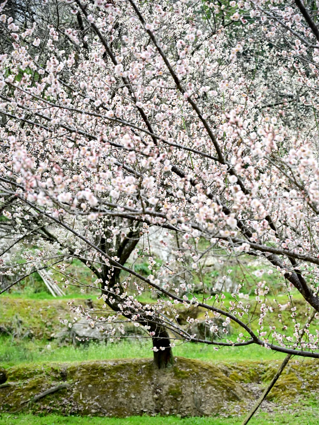 漫山梅花如云似雪、古树苍劲、炊烟袅袅