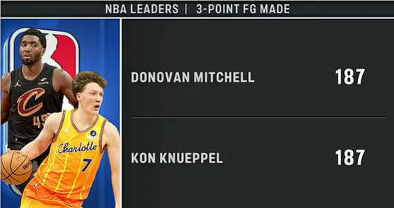 据NBA官方数据统计:骑士多诺万-米切尔和黄蜂康-克尼普尔在本赛季都已命中187记三分,二人命中三分的数量是相同的。