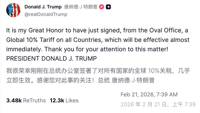“我非常荣幸地刚刚在椭圆形办公室签署了一项全球10%的关税命令,适用于所有国家,该关税将几乎立即生效。感谢您对此事的关注!”