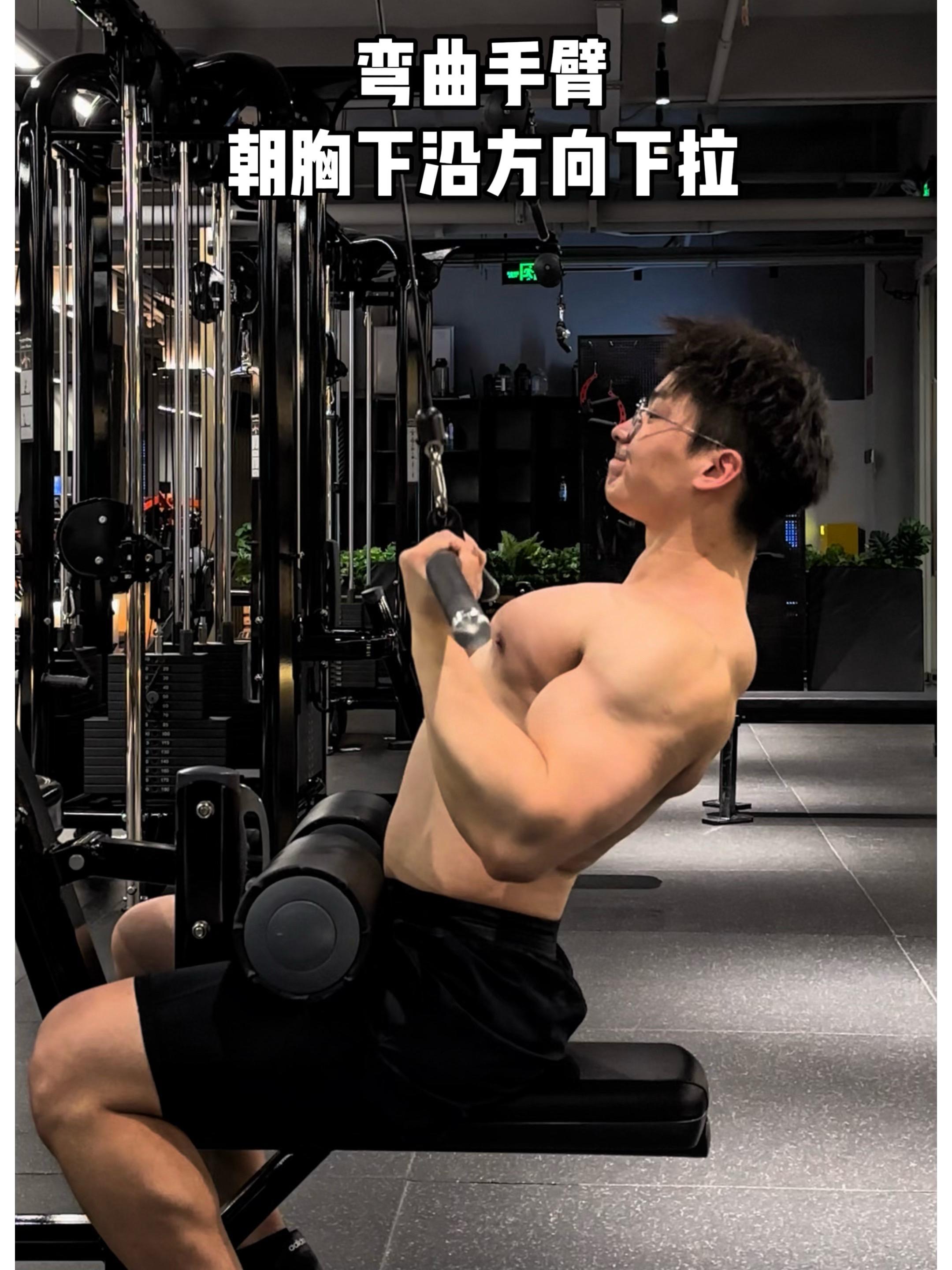 顺着绳索往下拉,杆拉至底部时,小臂与绳索要尽量在一个平面内,这样能够最大程度的避免肱二头肌代偿;