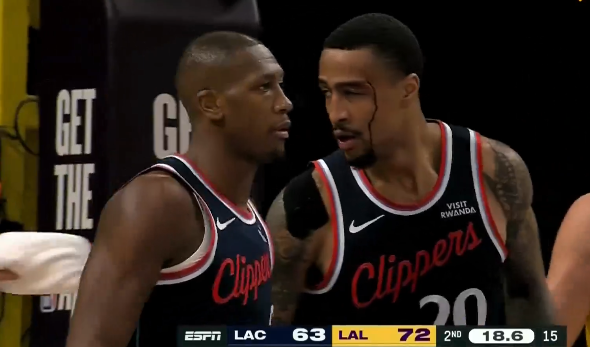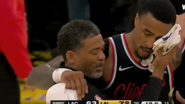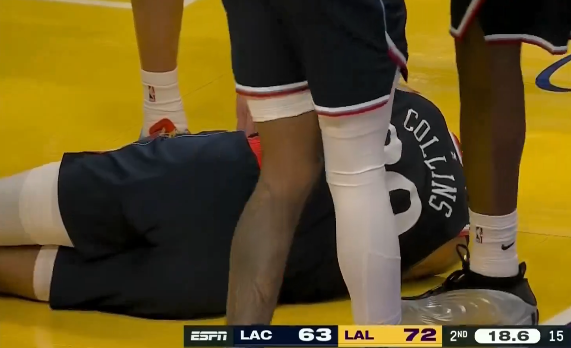 第二节比赛中,科林斯空接被海斯干扰失去平衡落地,头部着地眼角出血被扶回更衣室。