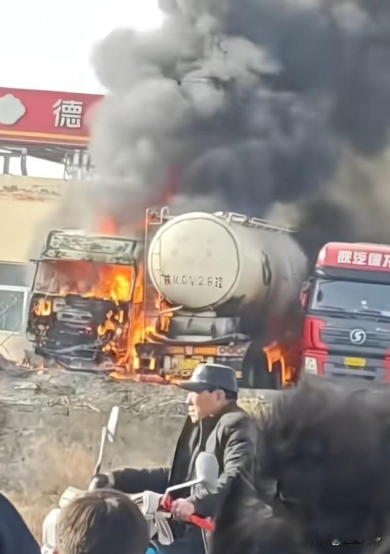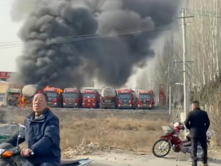 跟前有气站,不远处有个油站,带着全村赶紧跑啊,这么多人站原地看,准备升天仪式吗? 这些看热闹的胆子确实大,看着闹不嫌事大,油管里面又剩的油,爆炸了,冲击力很大的,赶紧跑有多远跑多远。这要是爆炸,这些人连拍视频的都要去报到 清一色的陕汽德龙,有可能还都是一个老板的车。都买车损了吧,这是一把上岸的节奏,比卖车合适多了。