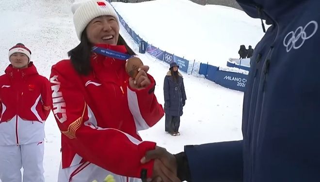 第一个走上领奖台之后,徐梦桃接过铜牌之后大笑着向颁奖嘉宾表示,“这是我第一枚奥运会铜牌”。