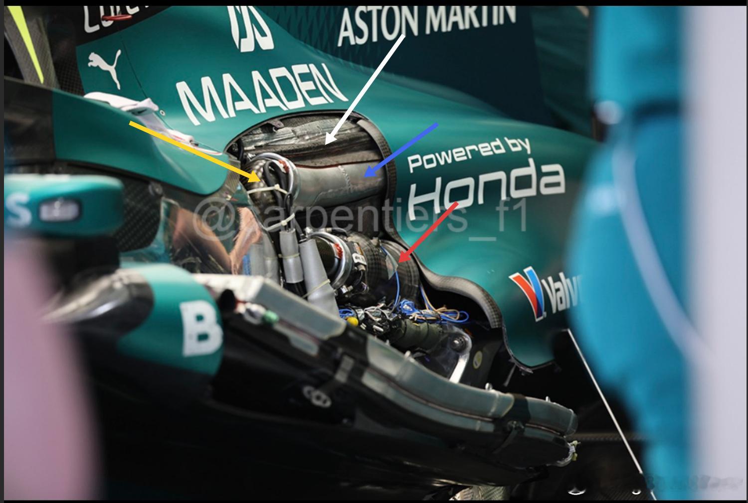 图3和图4为马丁AMR26在巴林测试的图片,目测实际用上了碳纤维稳压腔(红色箭头)。另外基于图3,再根据高压增压管(黄色箭头),推测中冷器(蓝色箭头)布置在稳压腔、引擎本体上方。再基于和中冷器密封完整的碳纤维导风板(白色箭头),或许当前本田采用的是风冷式中冷器。风冷式中冷器在当代F1应该是不太寻常的选择,大概是针对极紧凑布局的妥协。