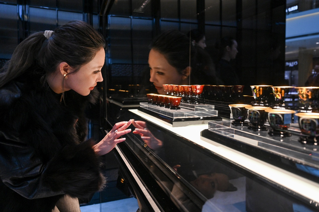 老铺黄金在恒隆广场展出“十二月花神漆器螺钿金杯”。受访者供图