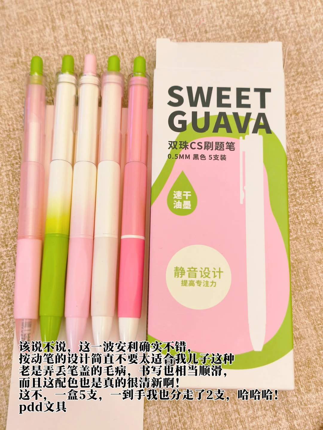 说来好玩,这几支看上去可可爱爱的按动中性笔竟然是被我儿子安利的!他说在同学那里借了一支用过之后,立马就决定要让我给他也买上一盒。该说不说,这一波安利确实不错,按动笔的设计简直不要太适合我儿子这种老是弄丢笔盖的毛病,书写也相当顺滑,而且这配色也是真的很清新啊!这不,一盒5支,一到手我也分走了2支,哈哈哈!