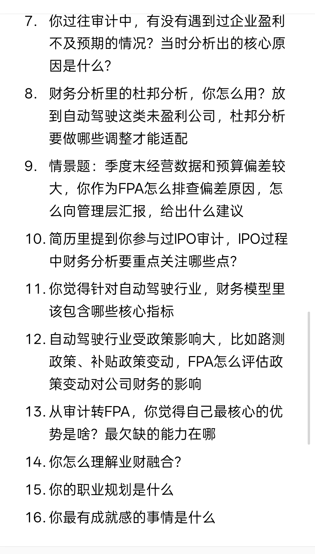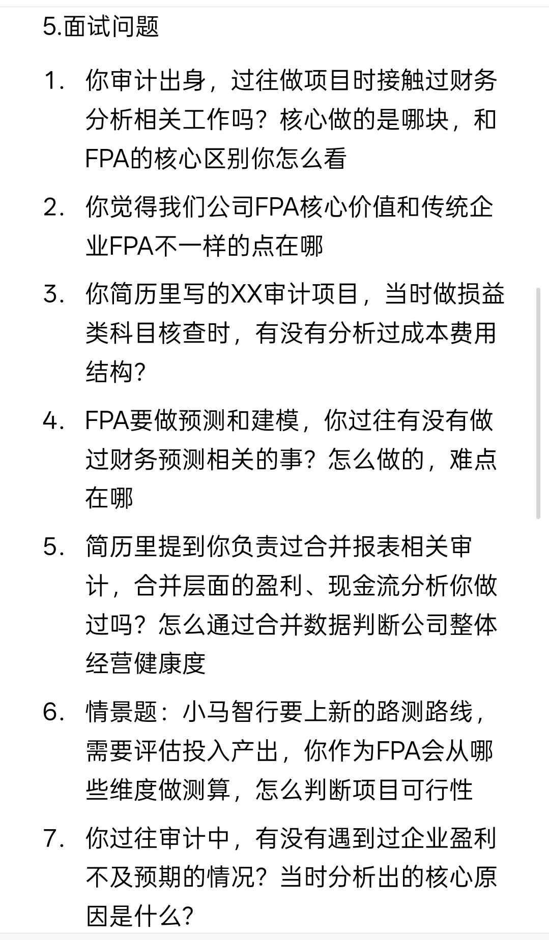 1. 你审计出身,过往做项目时接触过财务分析相关工作吗?核心做的是哪块,和FPA的核心区别你怎么看