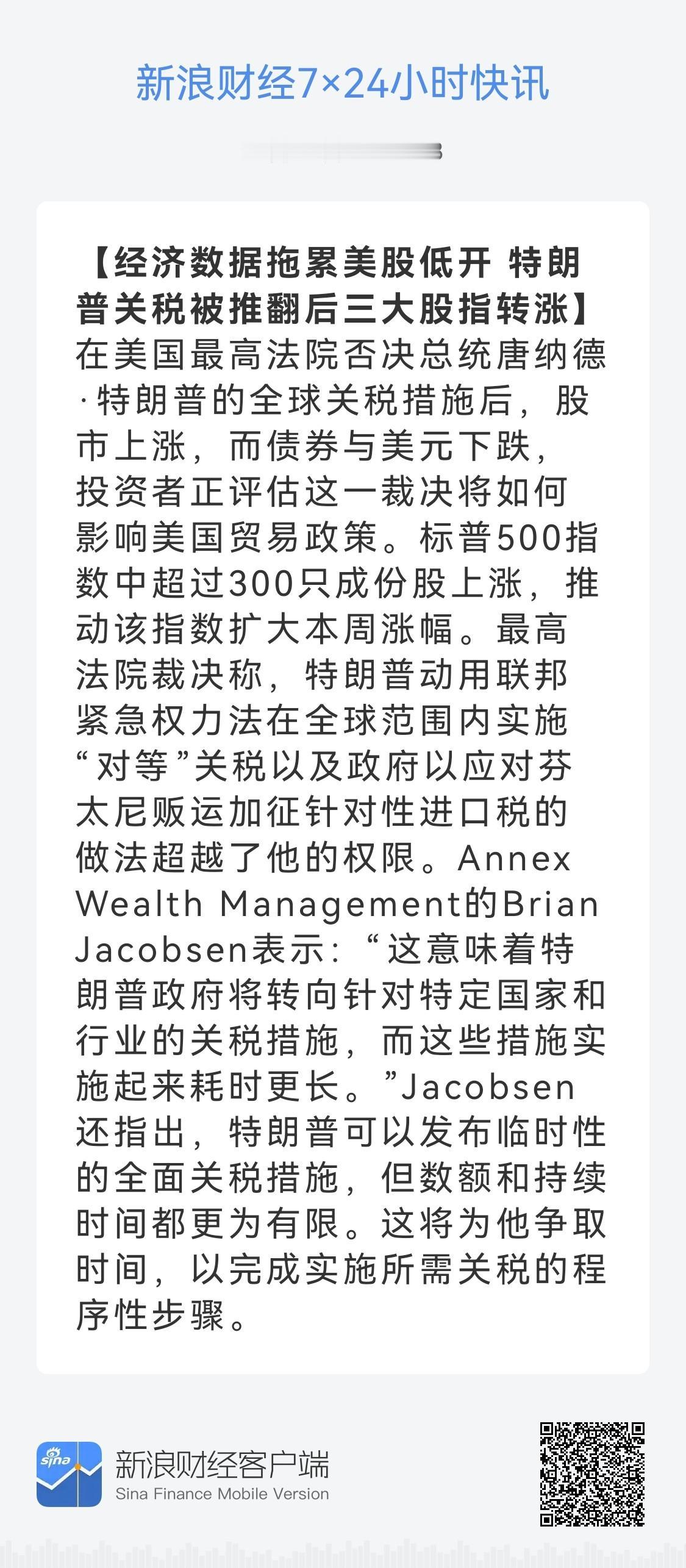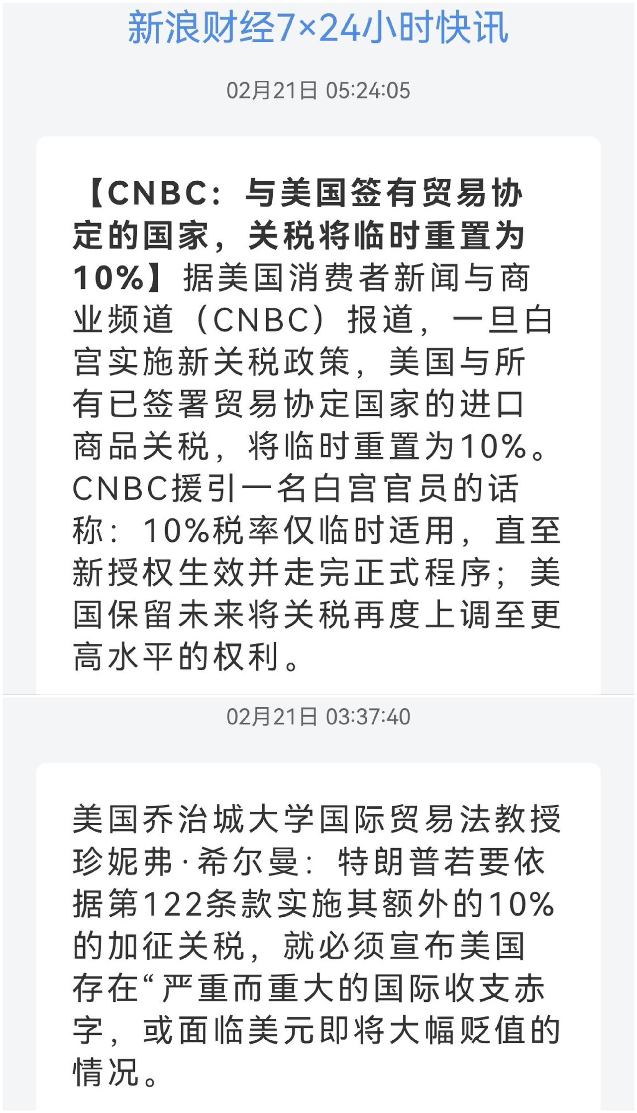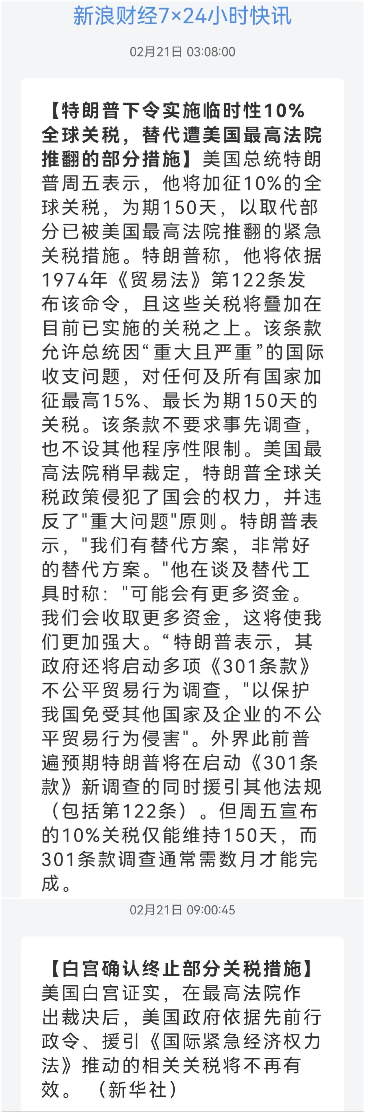特朗普实施10%全球临时关税 中国影响几何 在特朗普全球关税措施被最高法院裁定违法而取消之时,特朗普下令实施临时性10%的全球关税,替代遭美国最高法院推翻的部分措施。依据1974年《贸易法》第122条,且这些关税将叠加在目前已实施的关税之上。该条款允许总统因重大且严重的国际收支问题,对任何及所有国家加征最高15%、最长为期150天的关税。该条款不要求事先调查,也不设其他程序性限制。美国白宫证实,依据先前行政令、援引《国际紧急经济权力法》推动的相关关税将不再有效。 法律法条众多,简单明确一点即可,这次被最高法院推翻的,全球性关税和芬太尼关税,也就是特朗普第二任上台后,突然发布的一起开干的、各方分别谈判的这部分名为“对等关税”的贸易纠纷。当然对于中国而言,就是最高互相加征至154%的那部分之一,经过谈判最后剩余24%对等关税和10%芬太尼关税。对等关税和芬太尼关税违法取消,特朗普又发动122条款以10%的关税取代。 而特朗普第一任中美之间的最高25%的关税,是基于301条款设立,所以不在此取消范围之内。301+122,调整之后,合计最高在35%了。 综合目前,应属利多! (图片来源网络侵权告知删除)