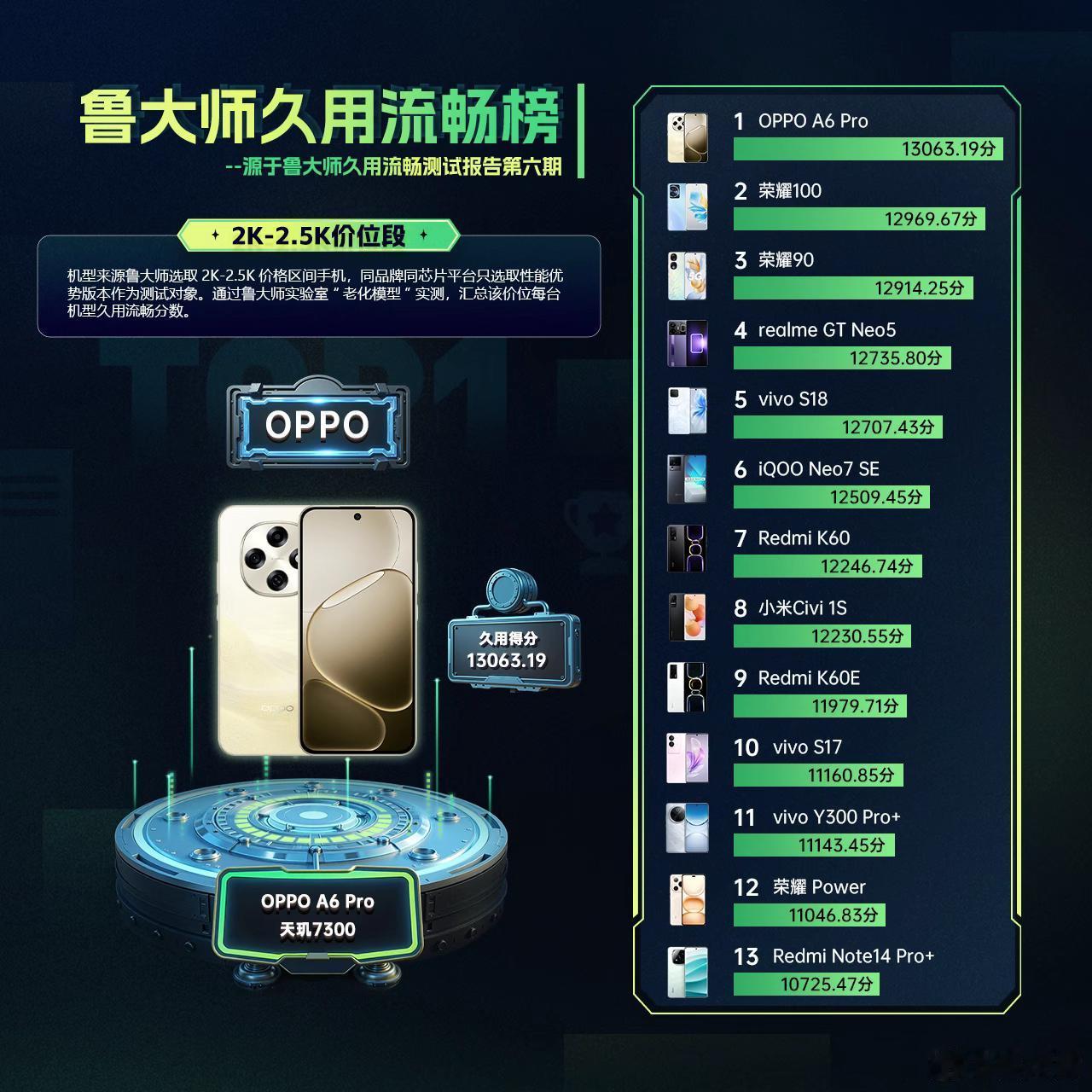 除此之外,A6 Pro拥有最高16GB大内存,在潮汐引擎、极光引擎,双引擎加持下的ColorOS,在鲁大师久用流畅测试中排第一。