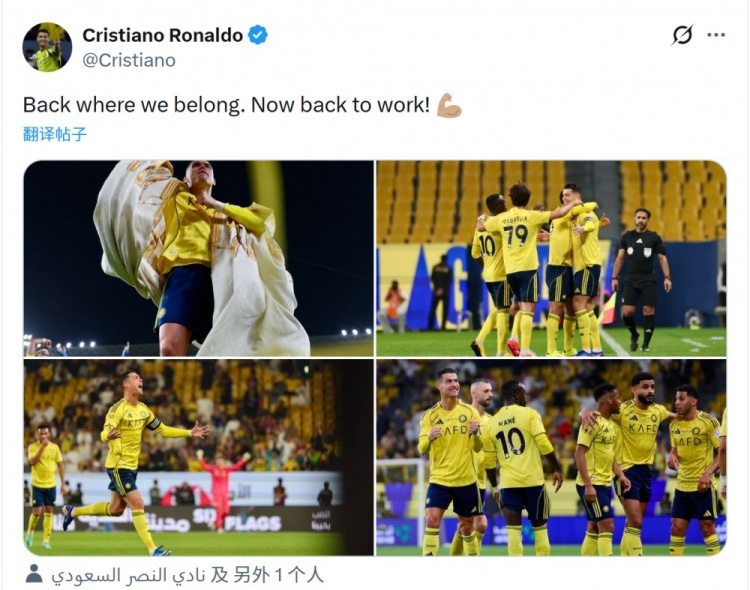 此役过后,利雅得胜利登顶沙特联赛积分榜,C罗社媒晒出比赛照片,配文:“回到了我们该在的位置,现在回去继续努力!”