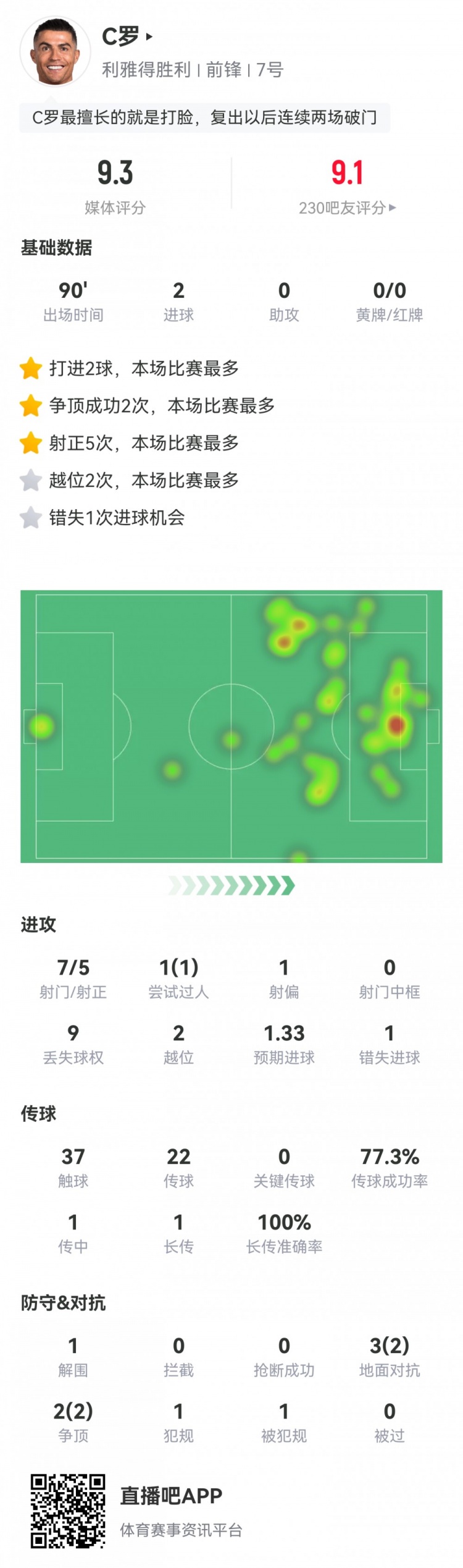 C罗此役为利雅得胜利踢满全场,打进2球,当选本场比赛最佳球员。