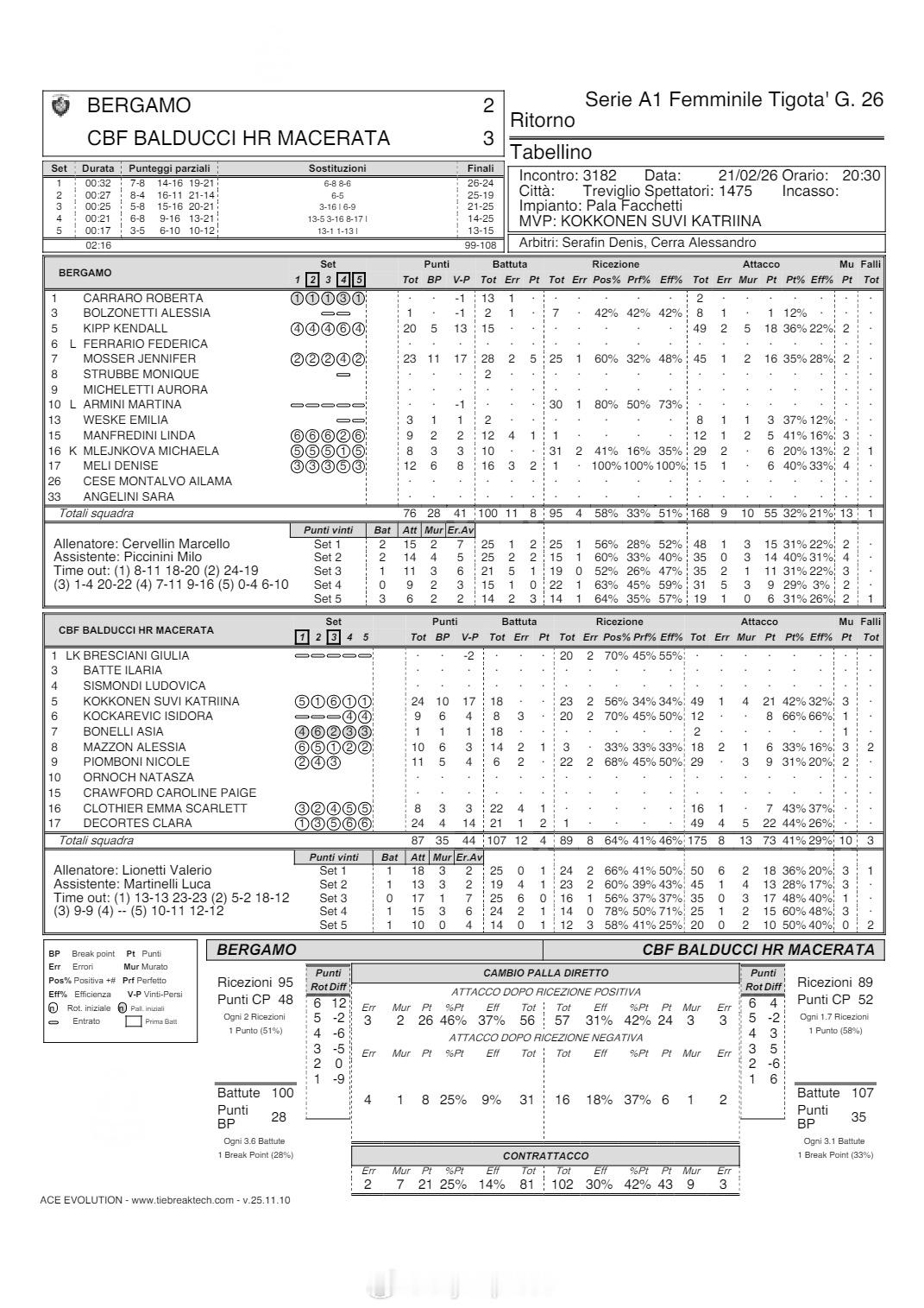 国际排坛战报速递2月21日,意甲女排第26轮暨常规赛最后一轮其余三场赛果如下(主队在前):佛罗伦萨1-3(23-25/22-25/25-18/17-25)诺瓦拉库内奥3-2(18-25/25-20/25-23/18-25/15-13)瓦莱福里亚贝尔加莫2-3(26-24/25-19/21-25/14-25/13-15)马切拉塔